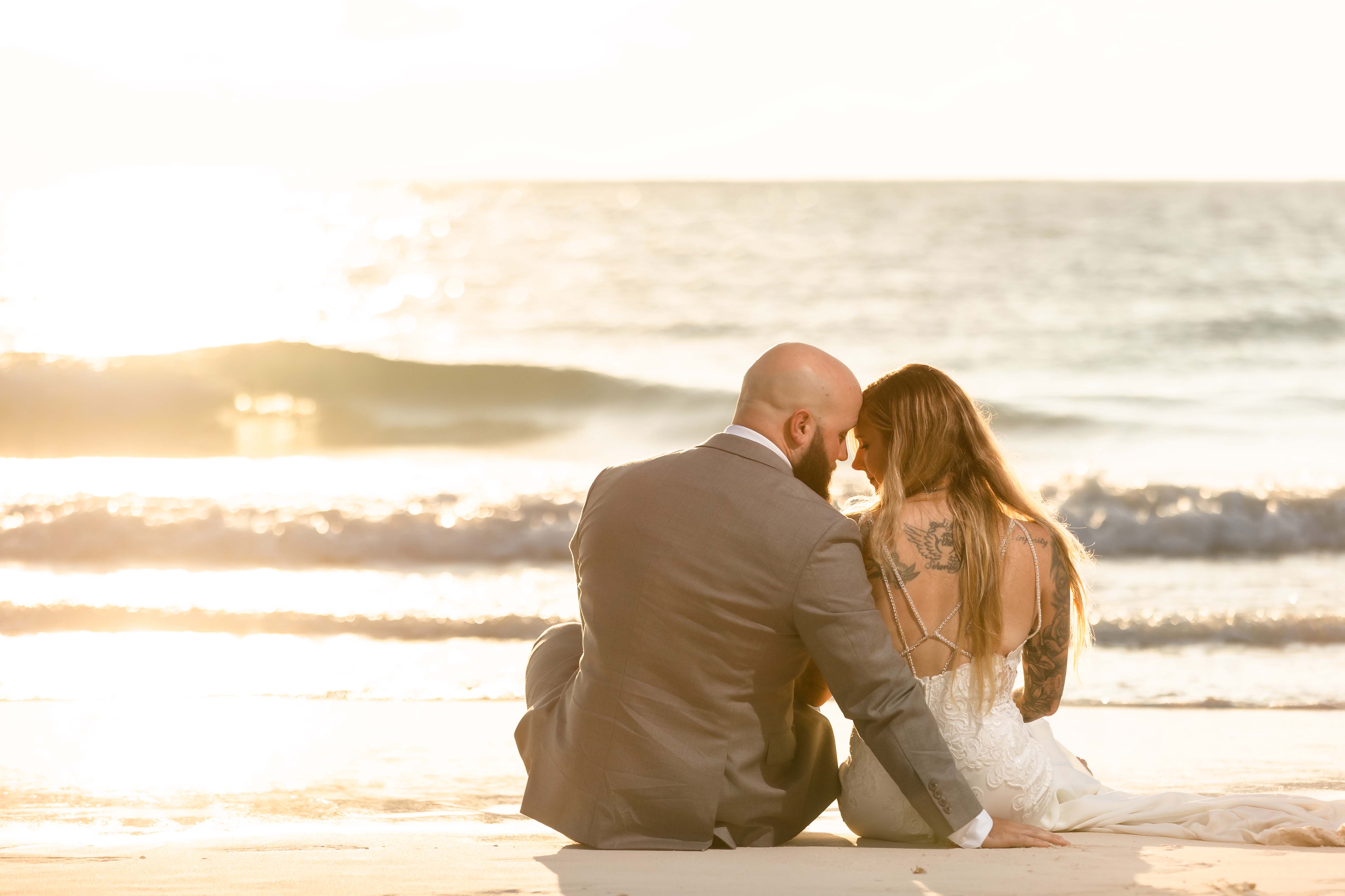 NewlywedsSitOnBeachTogetherAtSunrise
