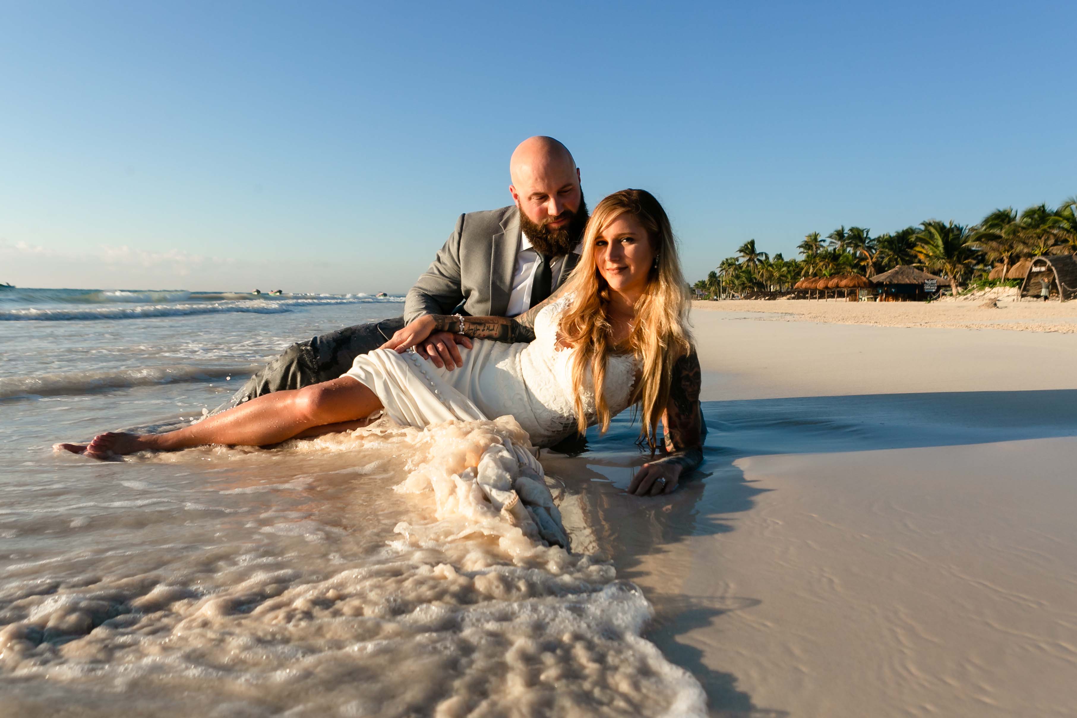 NewlywedsRecliningOnBeachInShallows