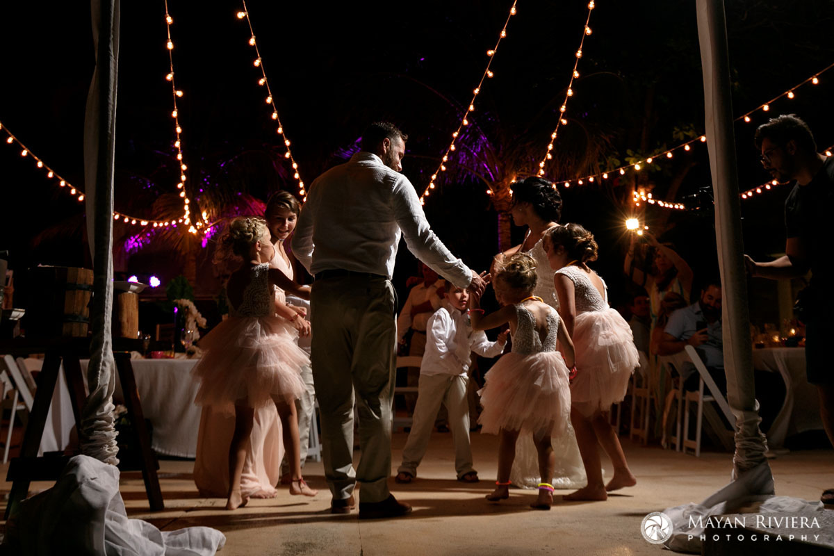 The reception was full of heartfelt speeches, delicious cuisine, and plenty of dancing. Azul Fives created an elegant yet fun atmosphere, blending fine dining with a lively Caribbean family vibe. Jennifer + Craig’s first dance was tender and emotional, before the party truly kicked off with music, laughter, and dancing under string lights. The kids made full use of the dance floor, twirling frilly skirts and having a blast with their spontaneous dance moves.