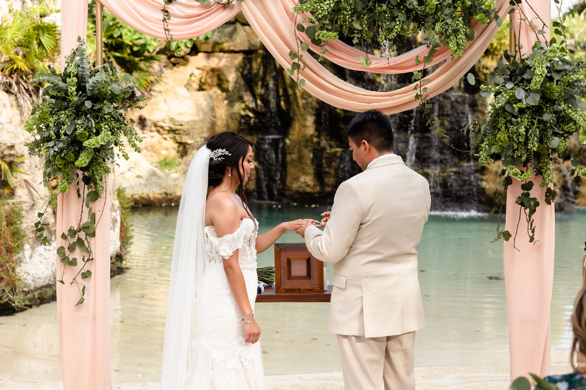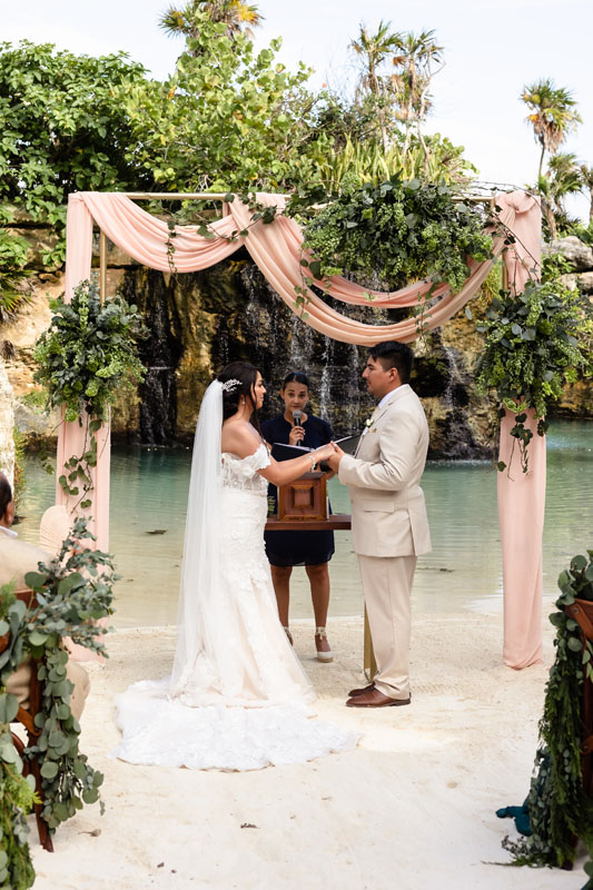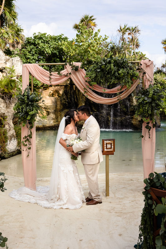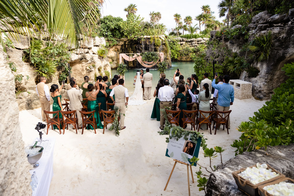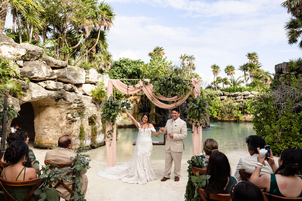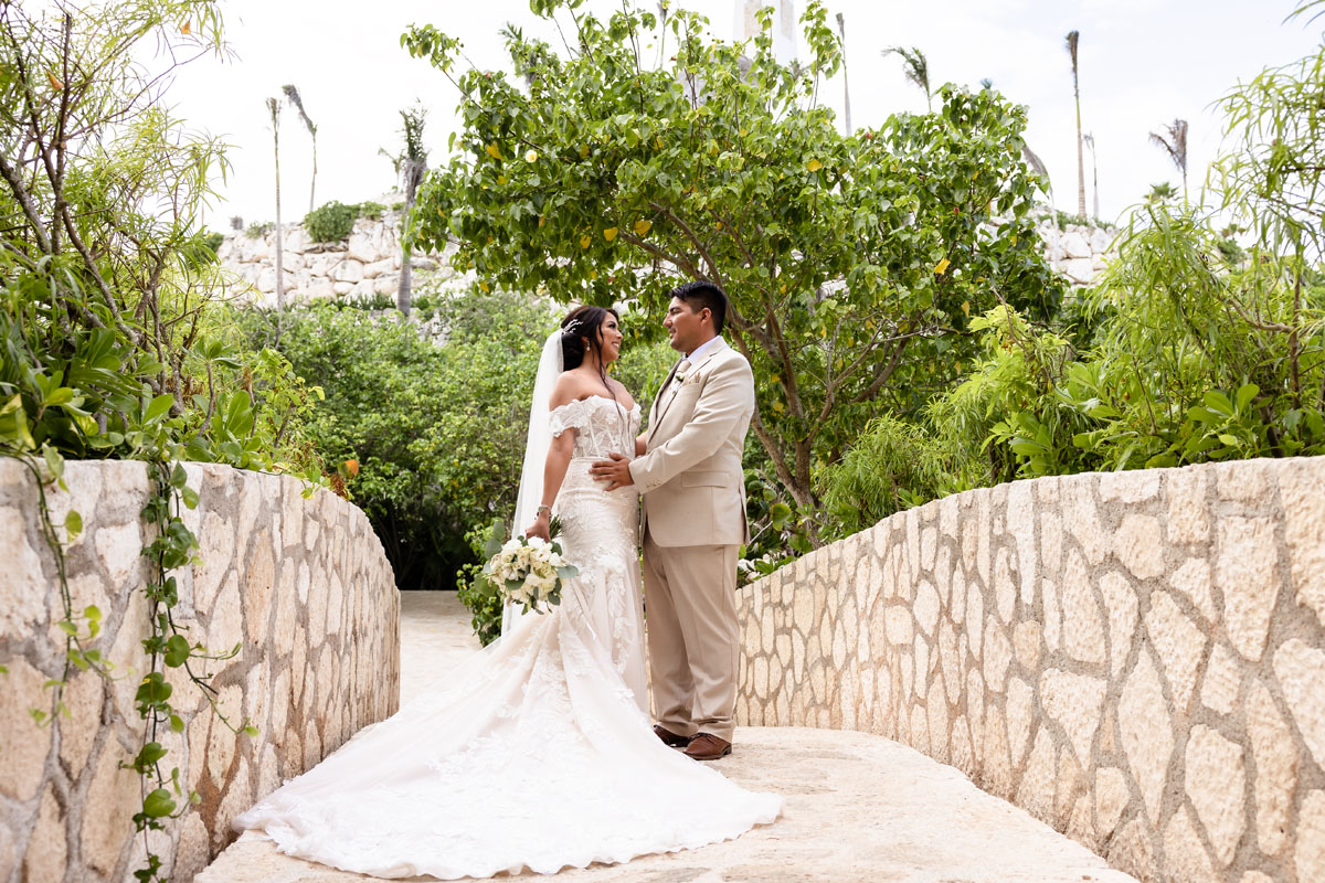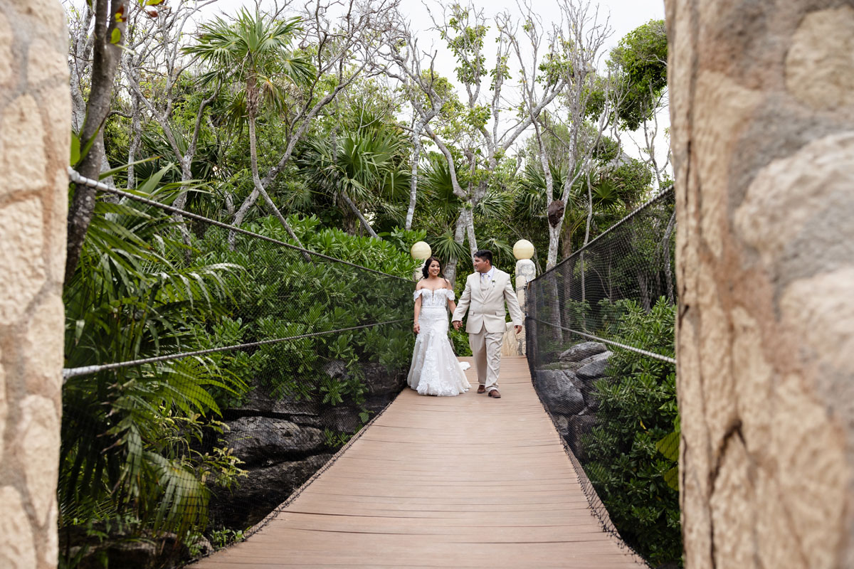 Hotel Xcaret Mexico is known for its iconic ceremony spaces, and Magali & Adan chose one of the most breathtaking. With turquoise water below, stone pathways all around, and vibrant green jungle framing their “I do,” their vows felt powerful, emotional, and beautifully intimate.