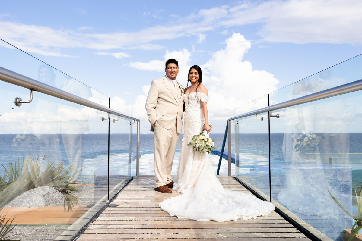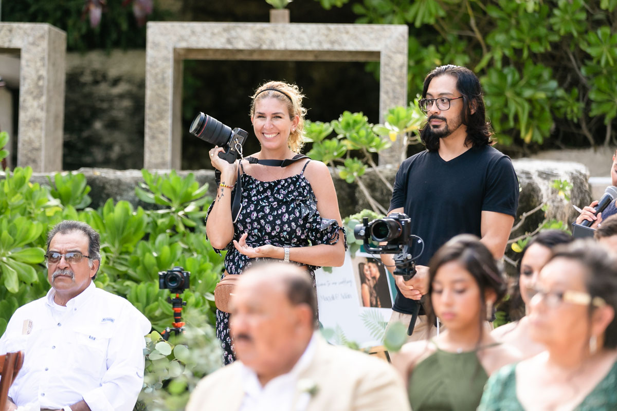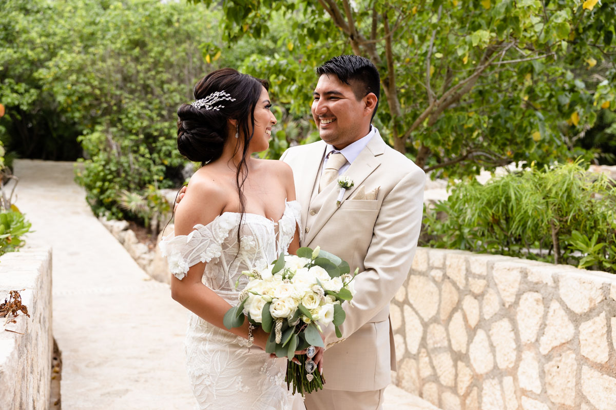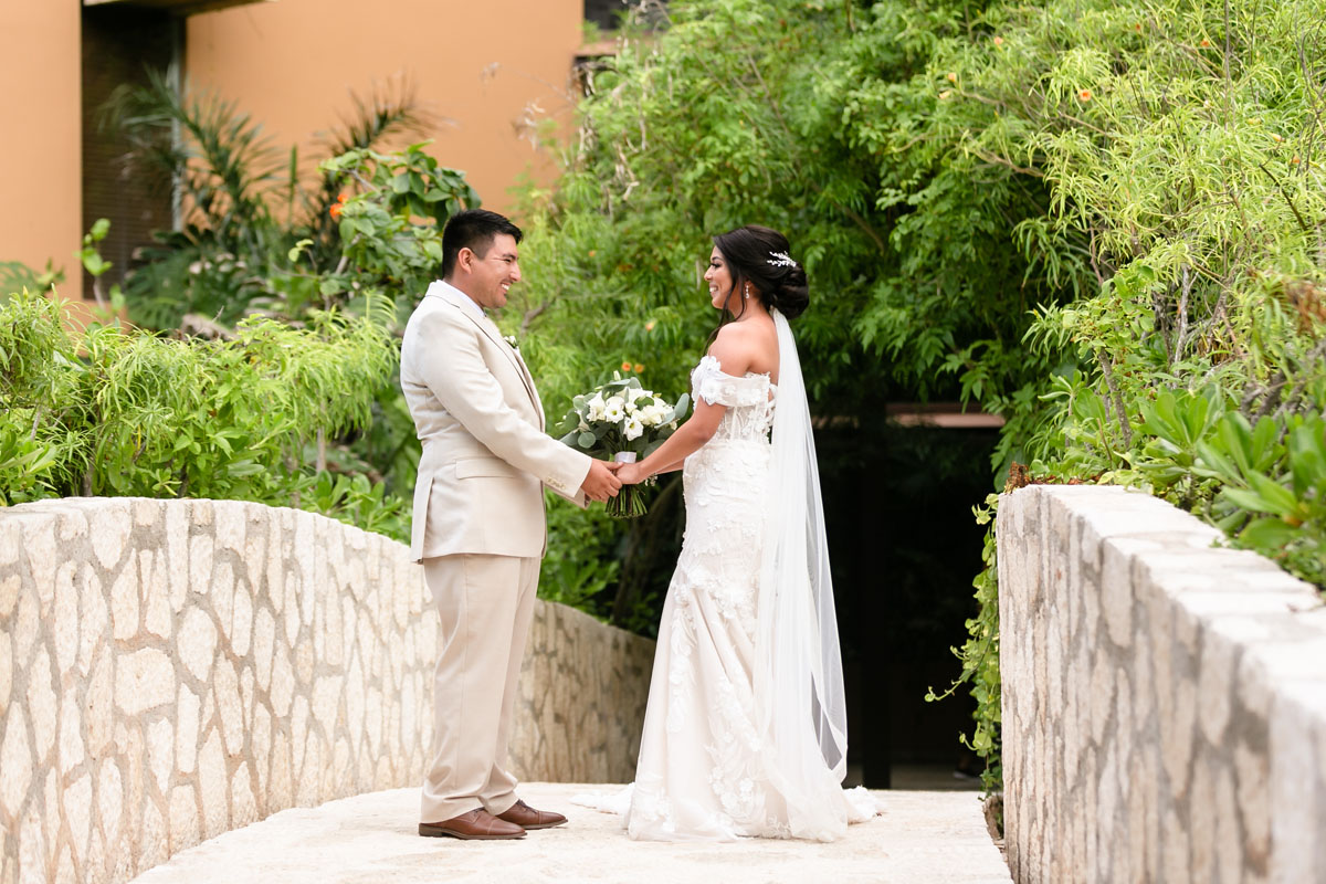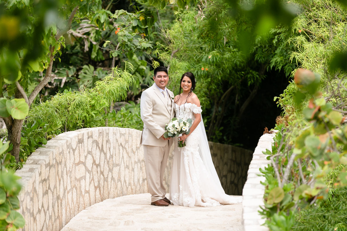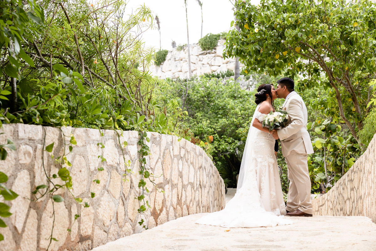 Hotel Xcaret Mexico is known for its iconic ceremony spaces, and Magali & Adan chose one of the most breathtaking. With turquoise water below, stone pathways all around, and vibrant green jungle framing their “I do,” their vows felt powerful, emotional, and beautifully intimate.