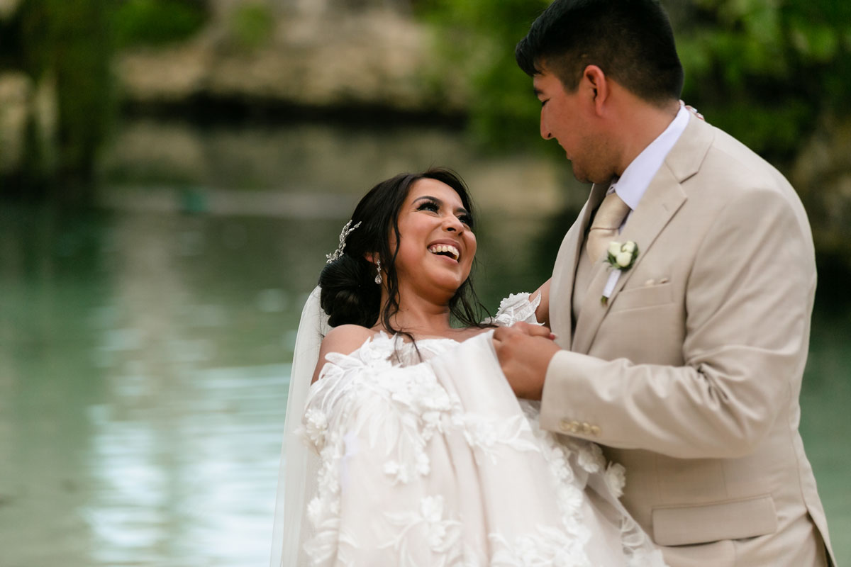 After the ceremony, we explored some of the resort’s most iconic spots. The winding river views, hidden coves, stone bridges, and towering rock walls all added depth and magic to their wedding portraits.