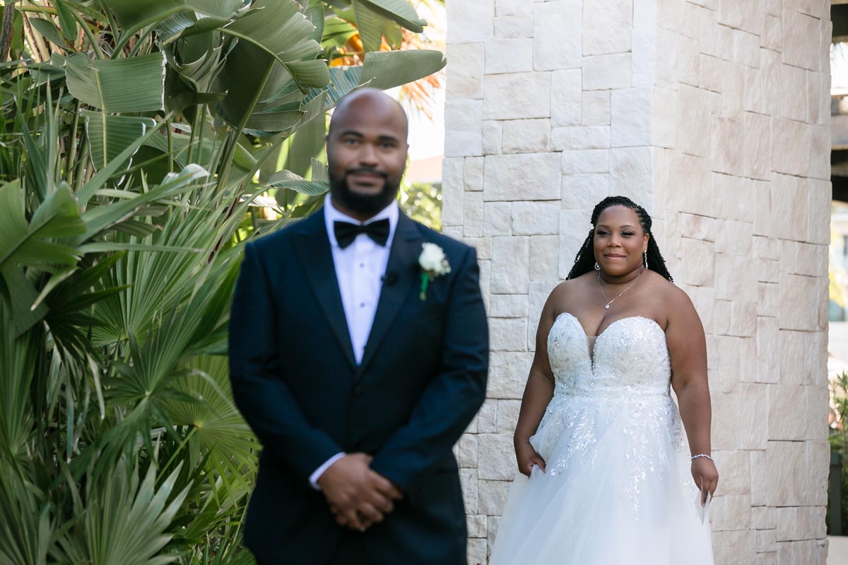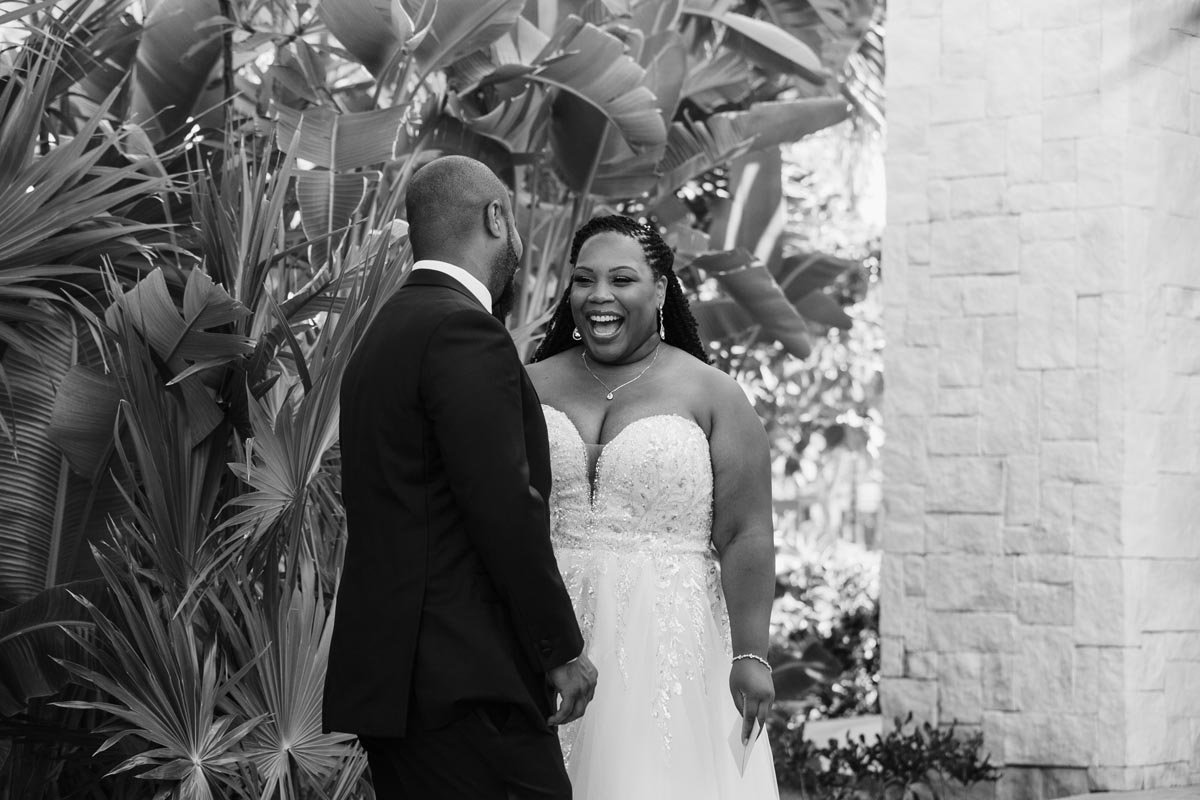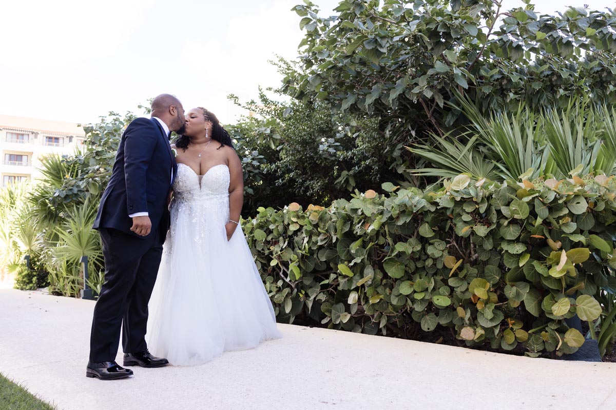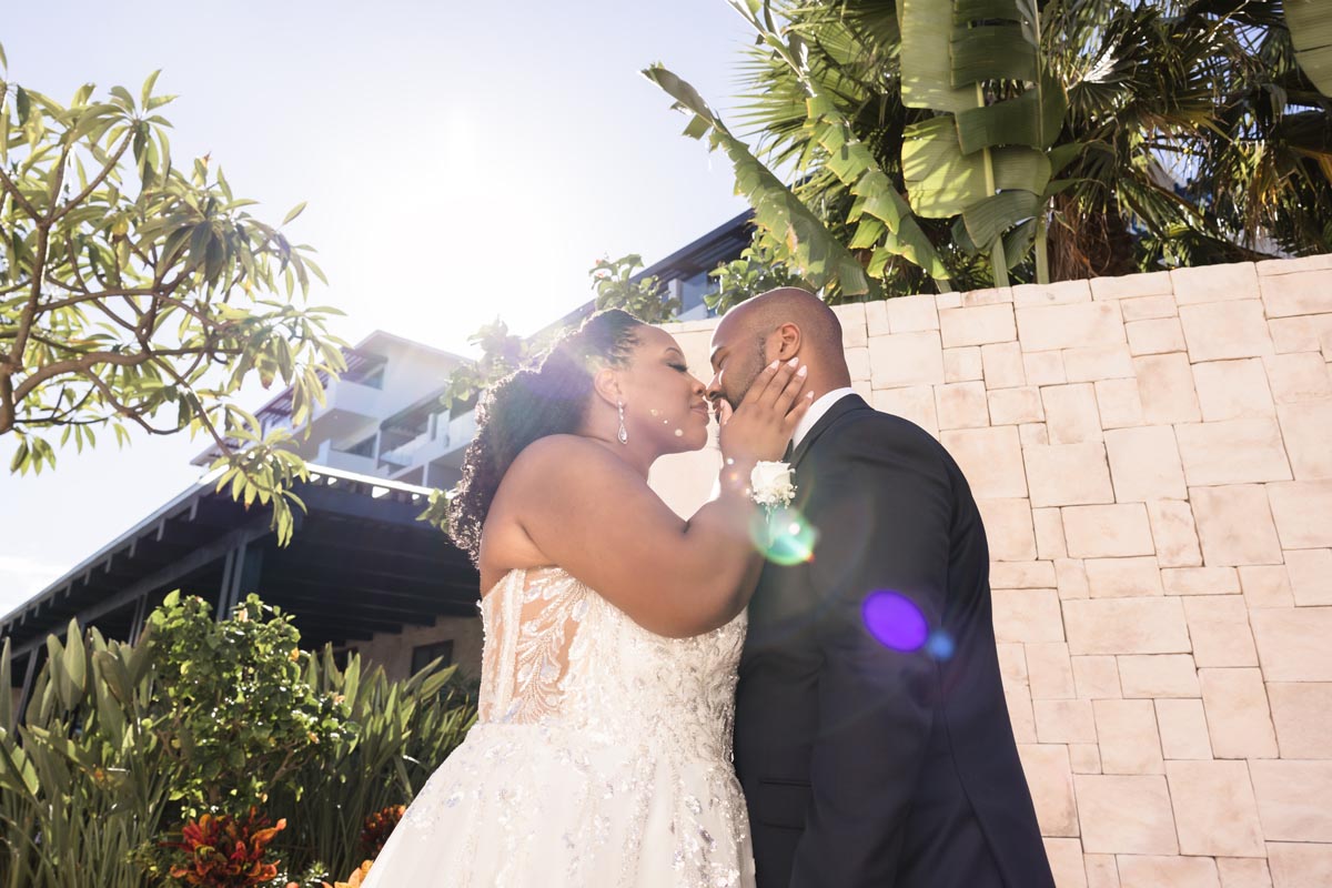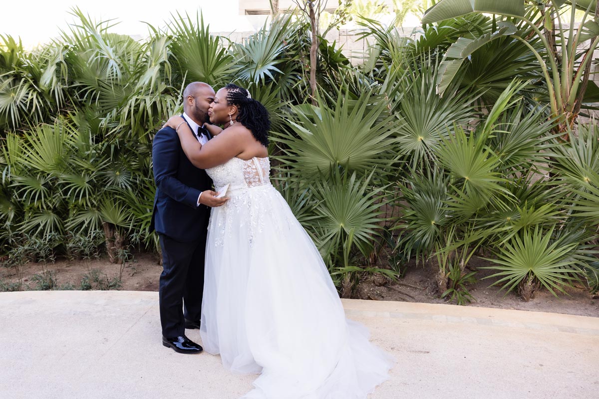 Wedding couple kiss after an emotional first look