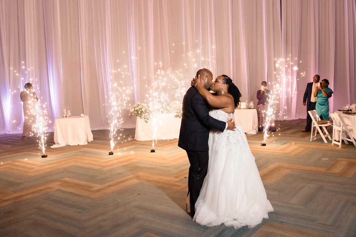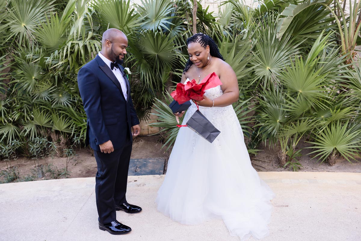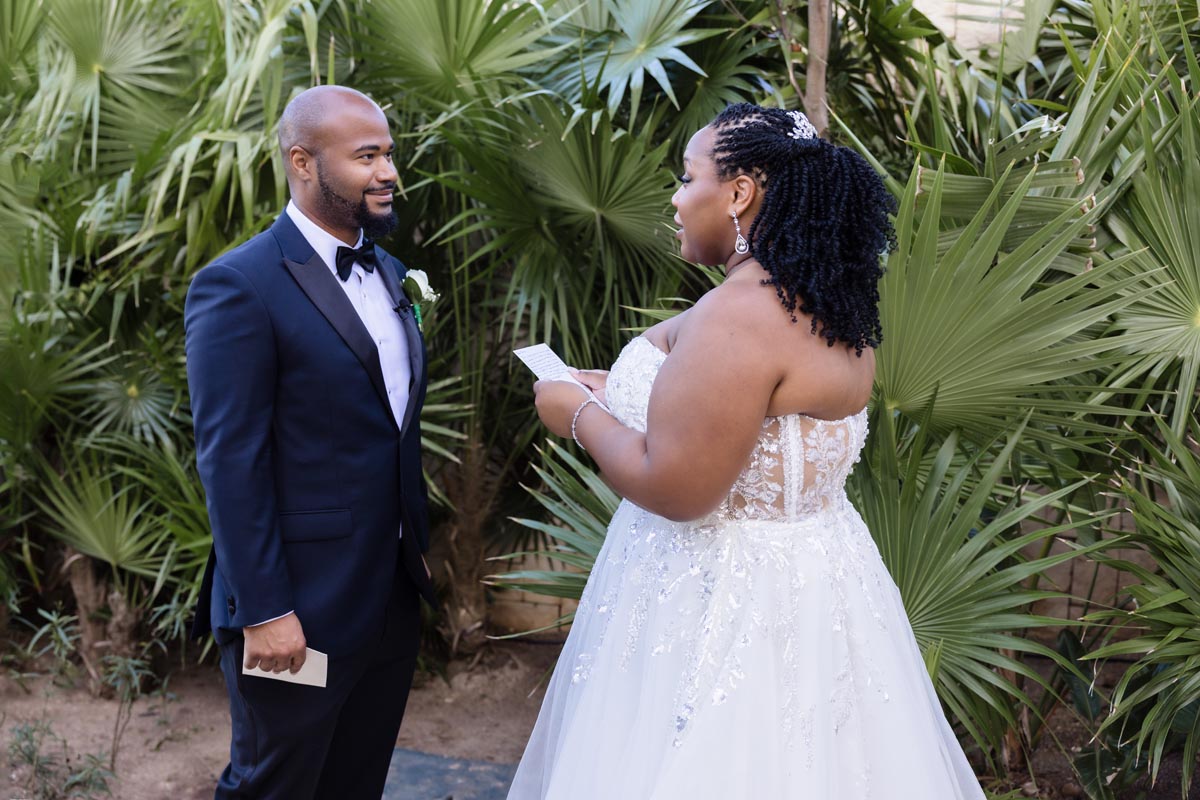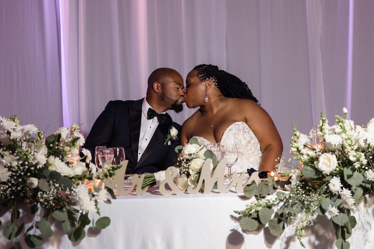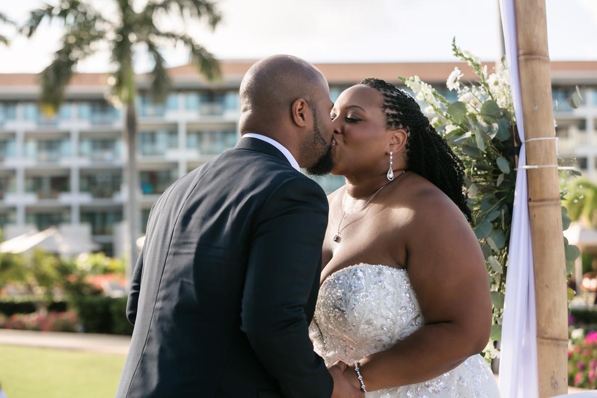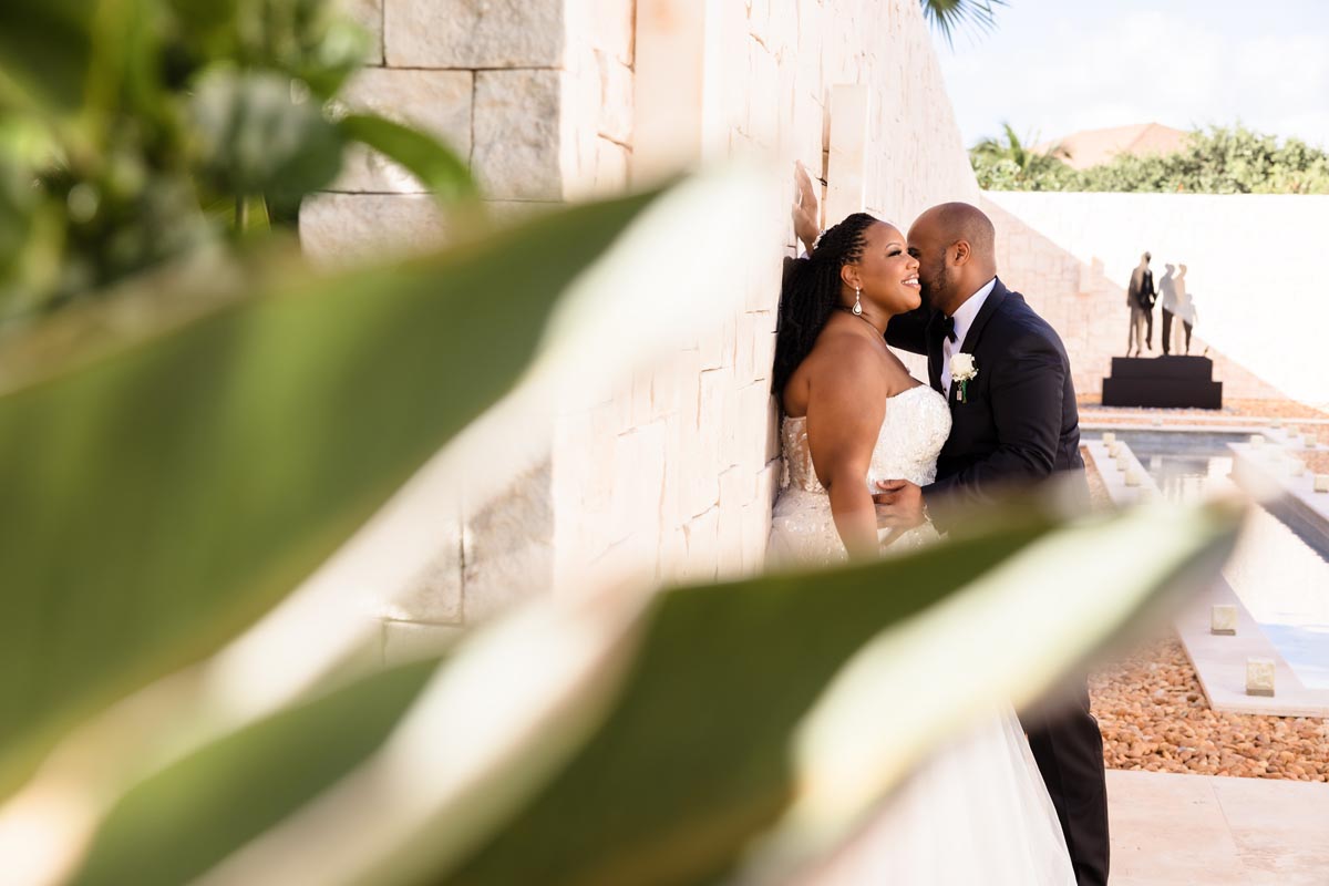 Wedding couple kiss after an emotional first look