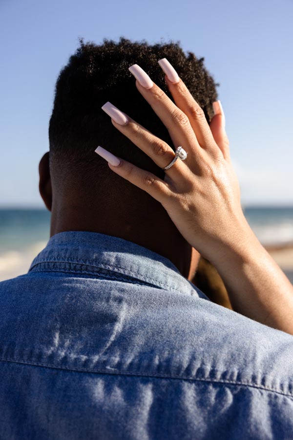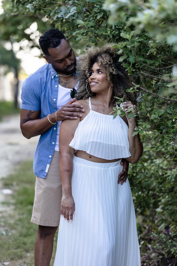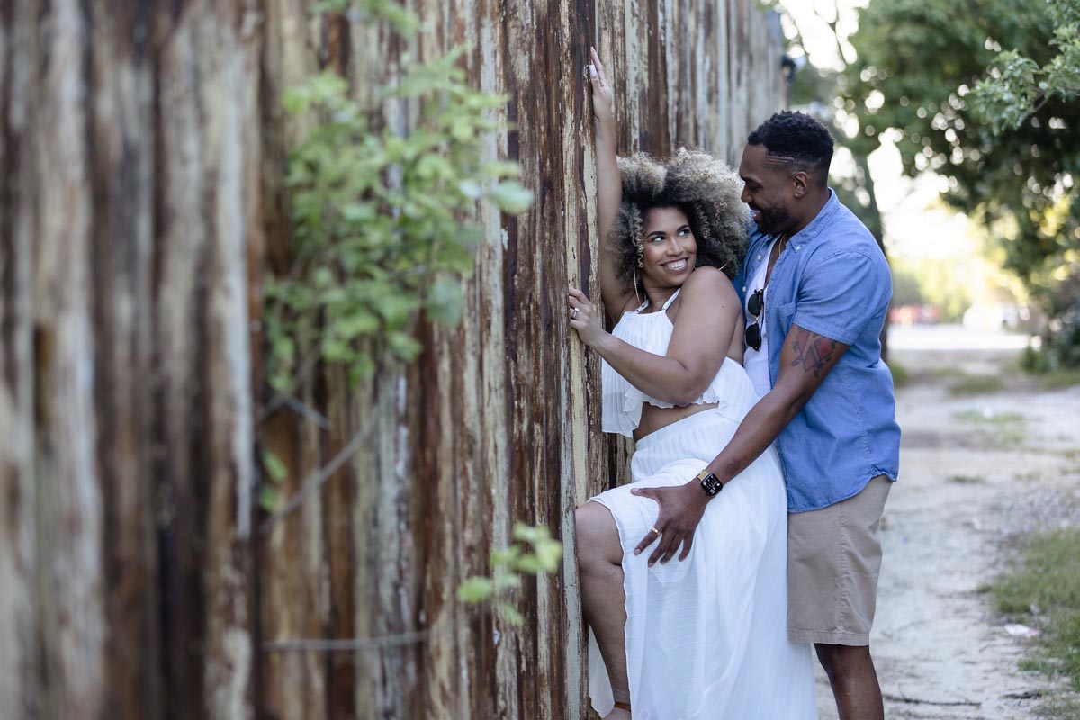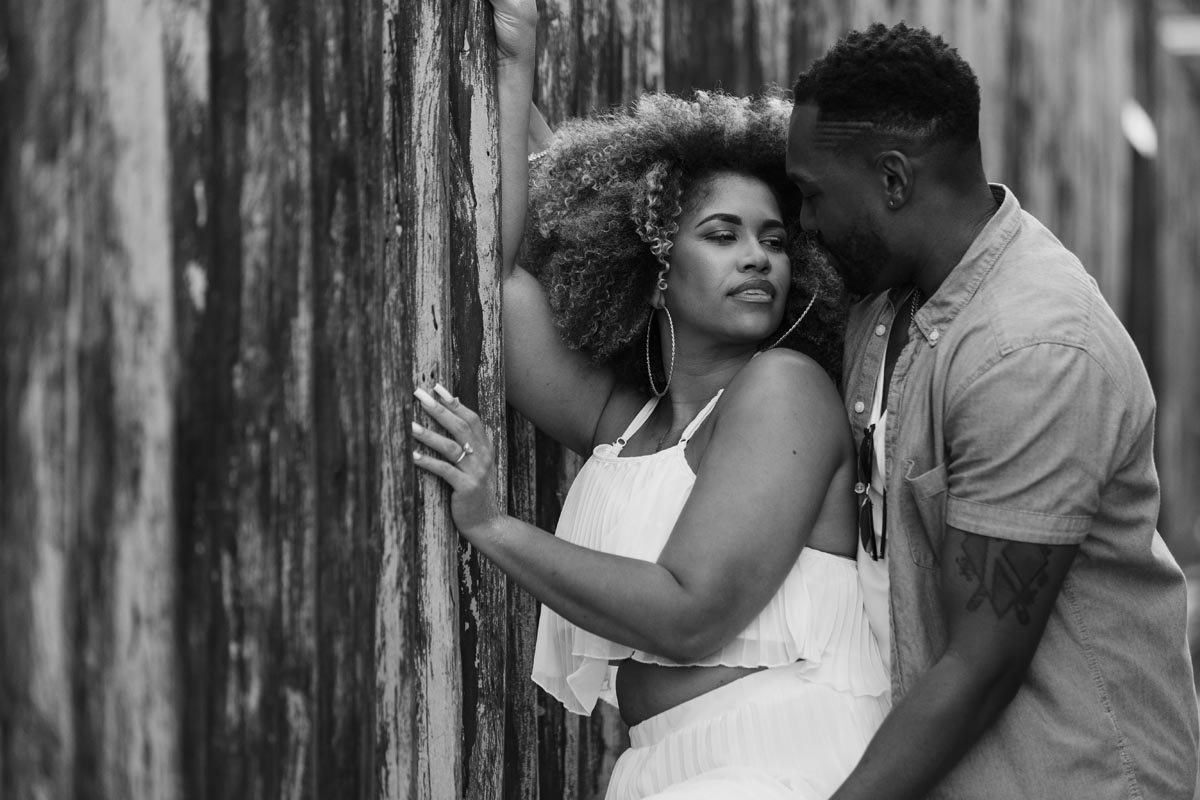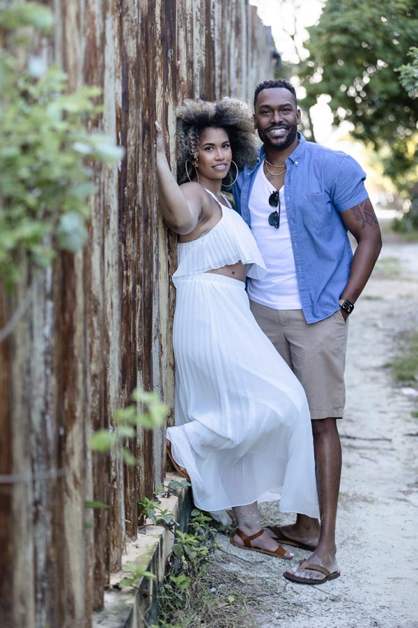 Newly engaged couple embrace against reed wall