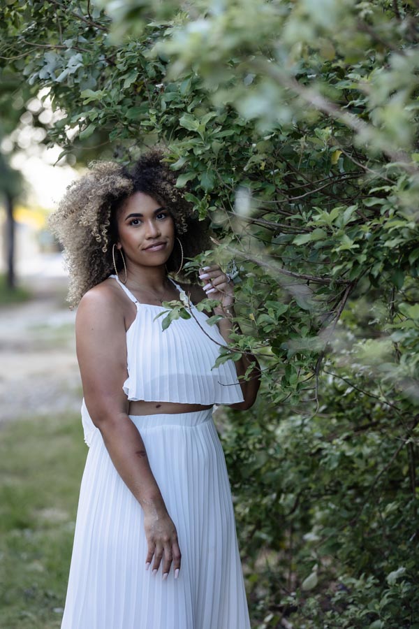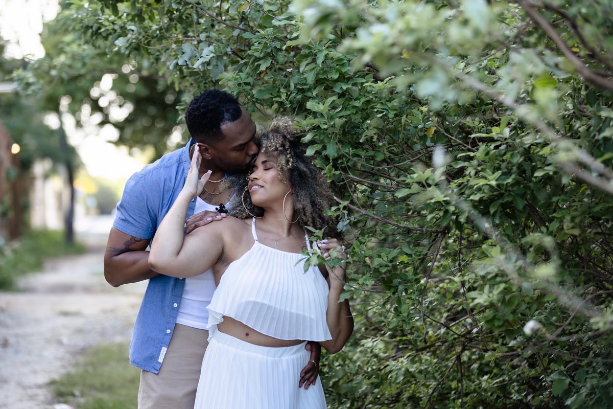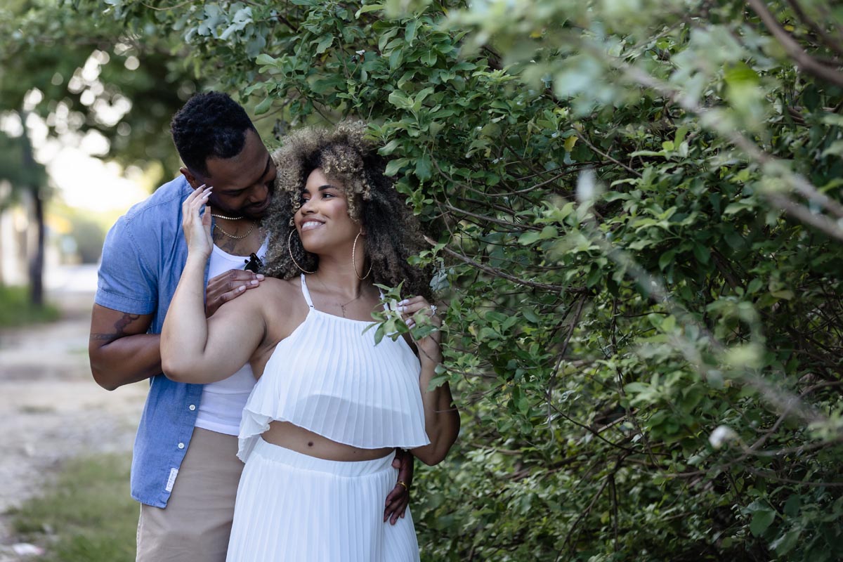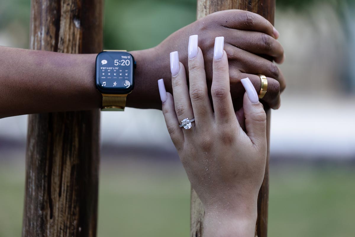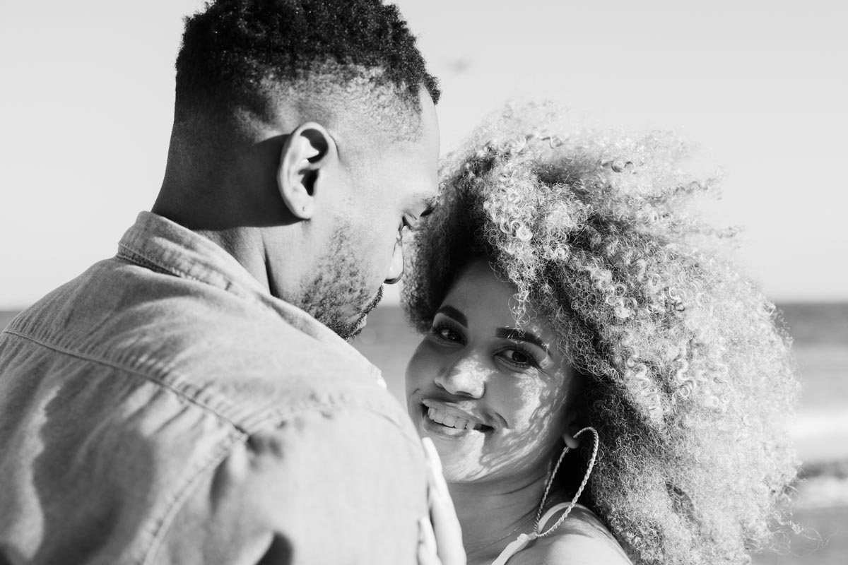 Newly engaged couple embrace against reed wall