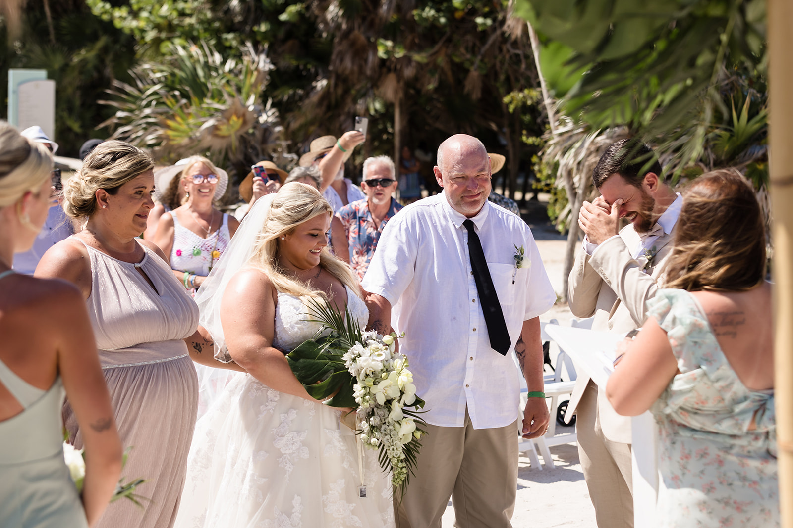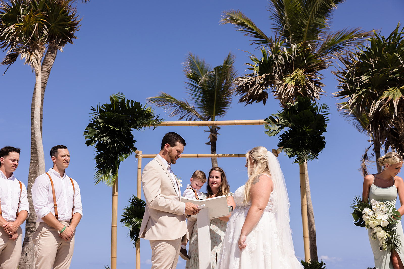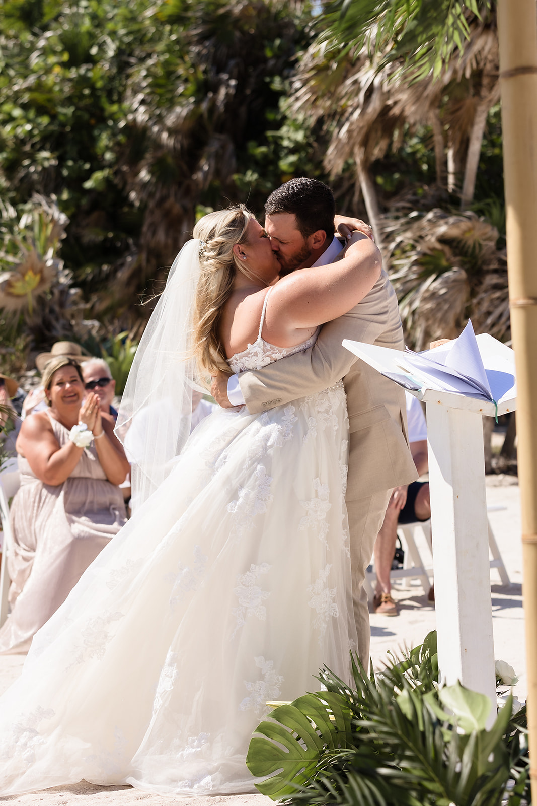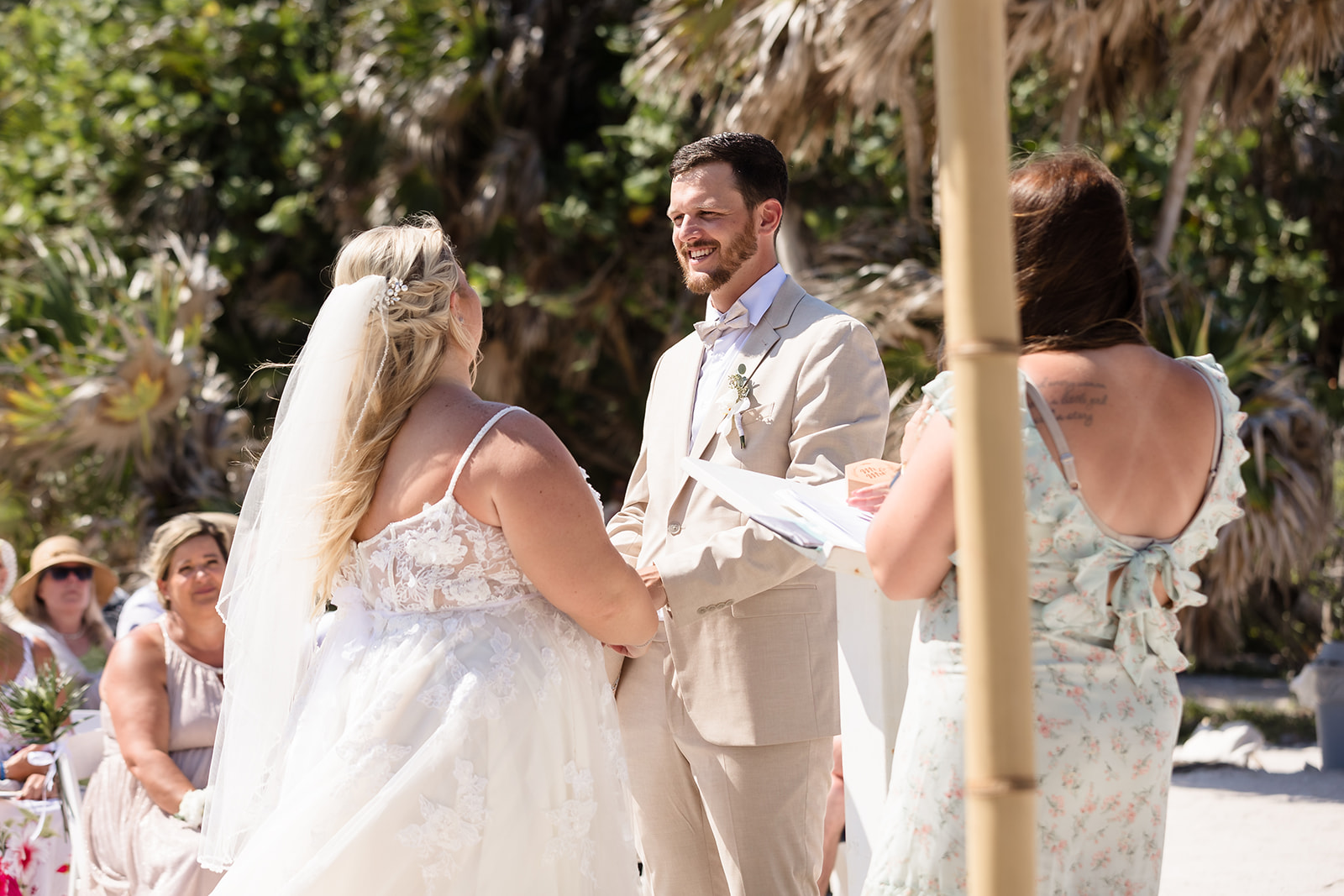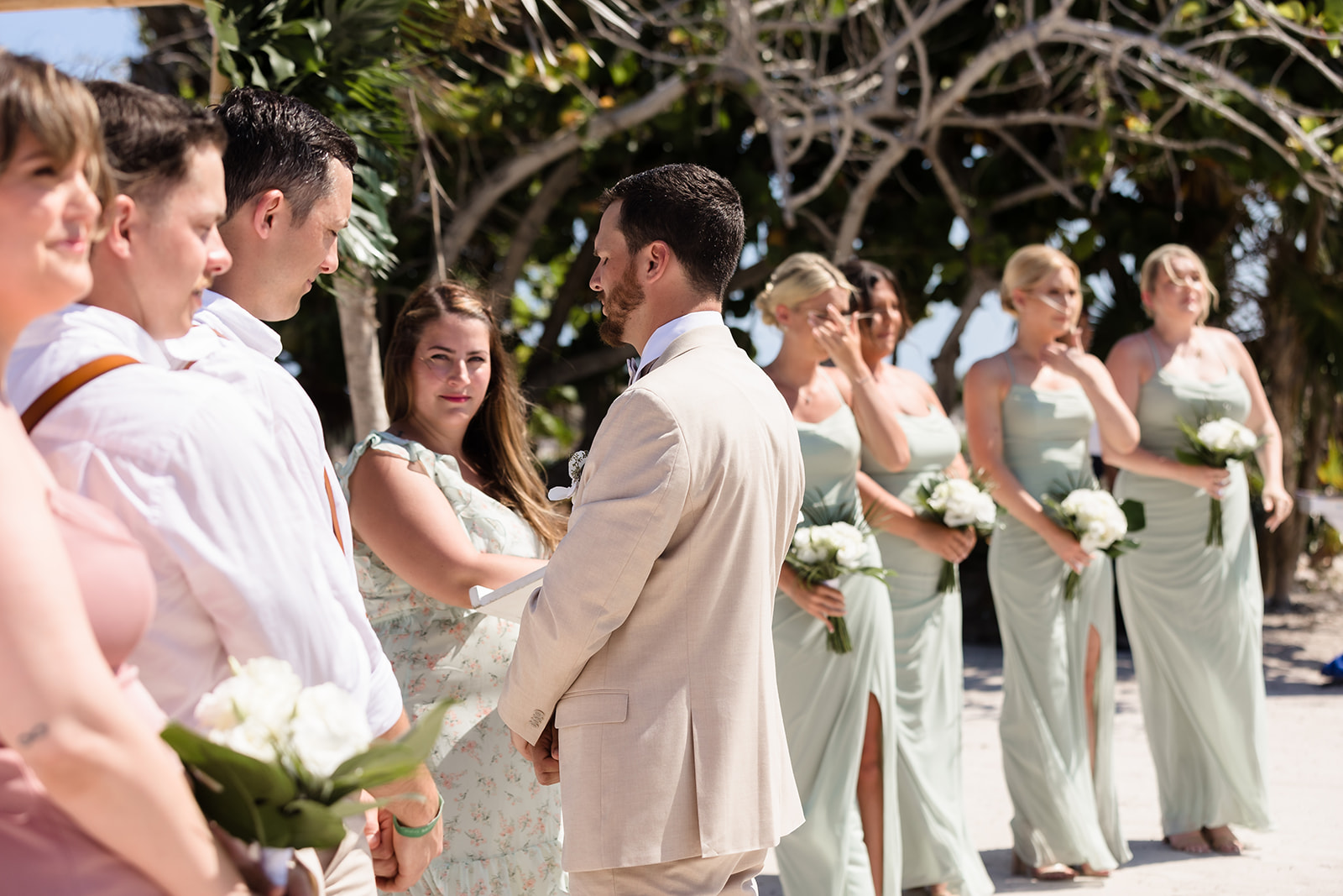 Their ceremony took place right on the sand, framed by the ocean and soft tropical florals. As Samantha walked in, smiles spread through the crowd and Davis’ face said everything as he wiped his eyes. The waves rolled in gently as they exchanged vows, creating an intimate atmosphere that felt both peaceful and powerful.