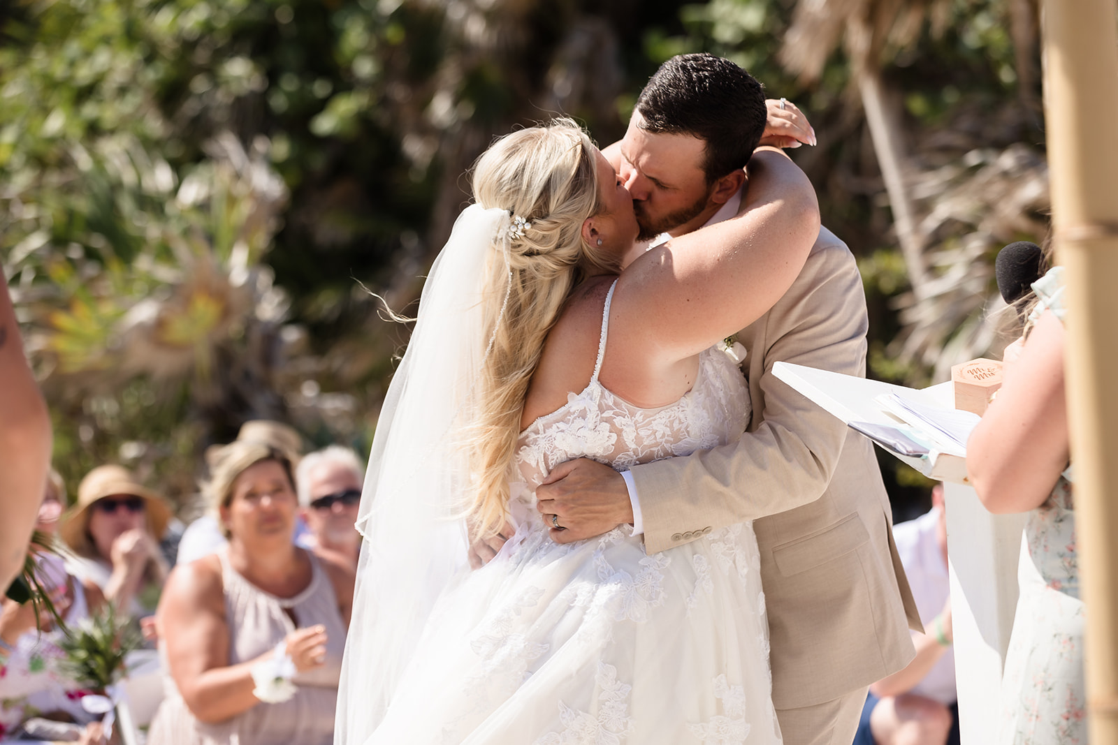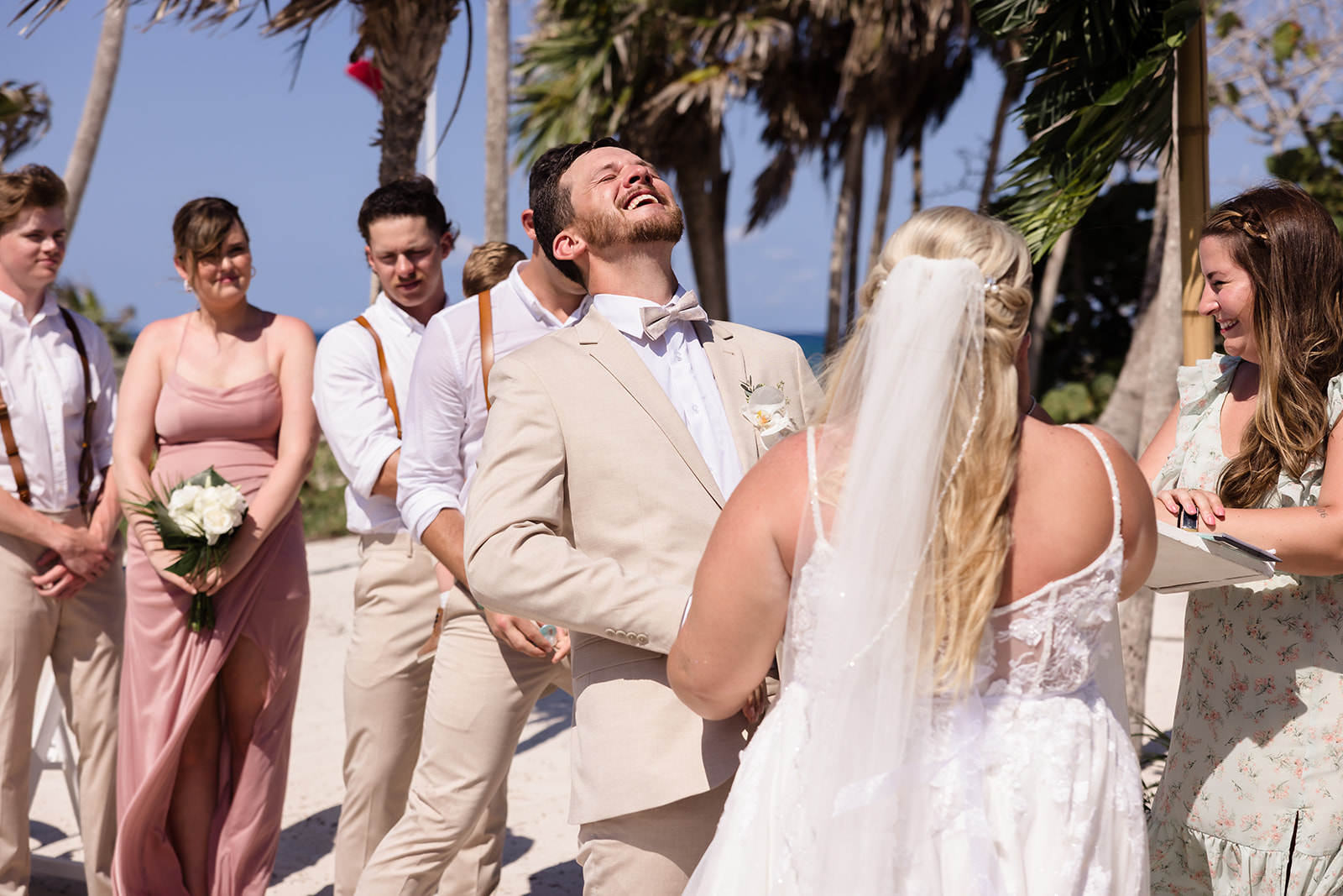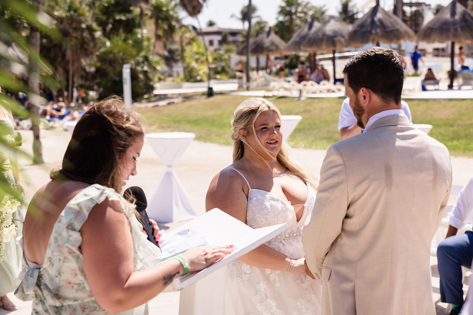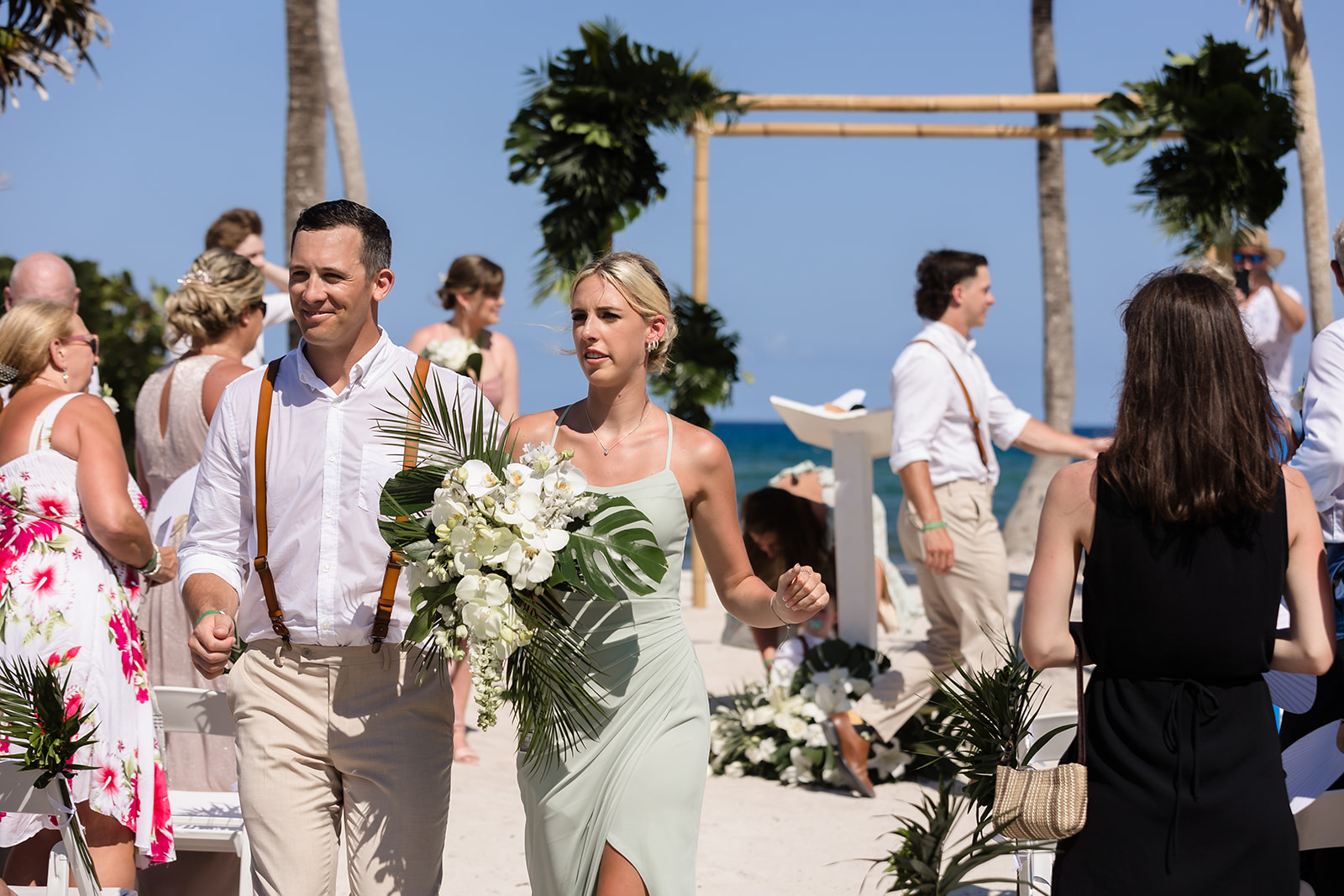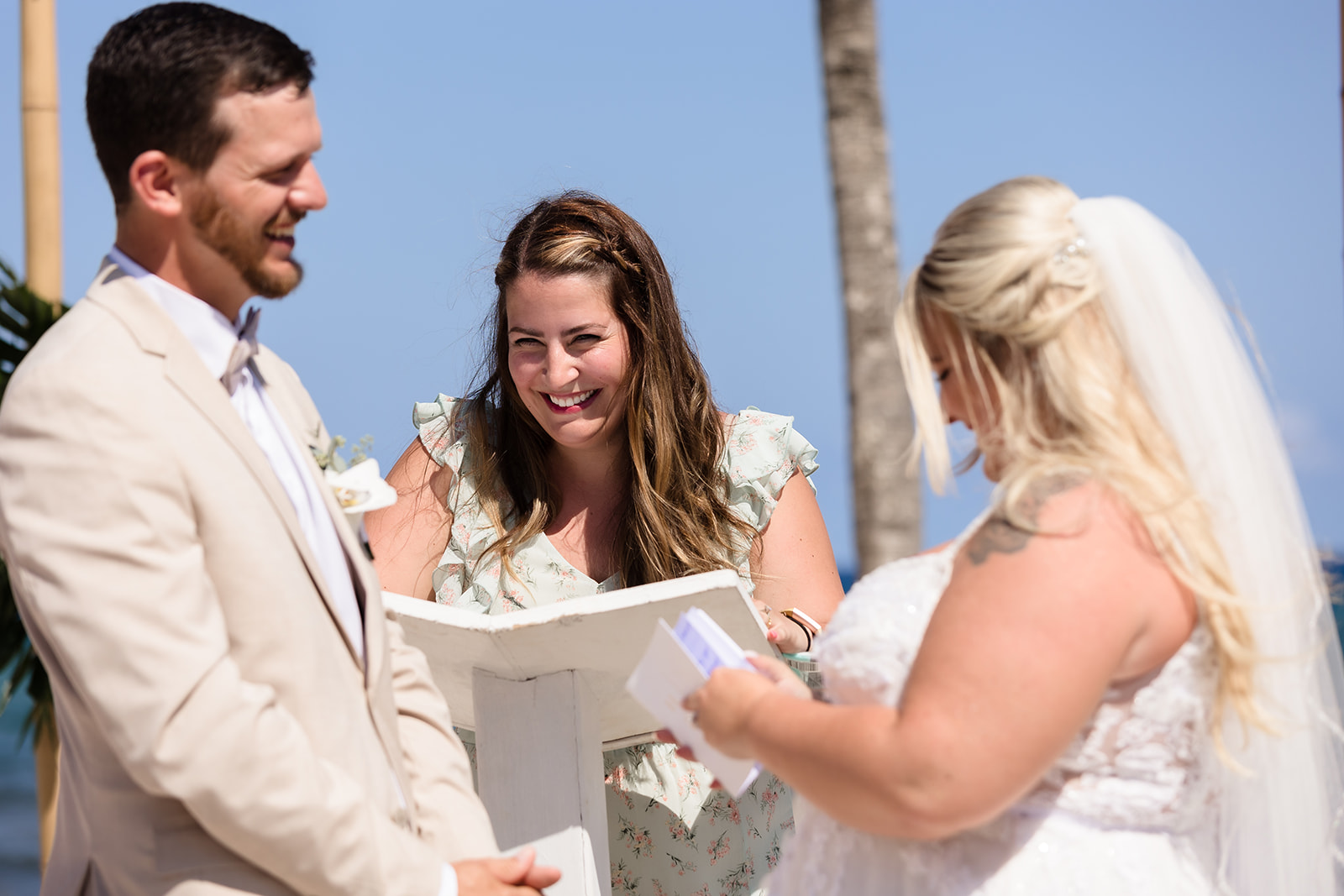 Their ceremony took place right on the sand, framed by the ocean and soft tropical florals. As Samantha walked in, smiles spread through the crowd and Davis’ face said everything as he wiped his eyes. The waves rolled in gently as they exchanged vows, creating an intimate atmosphere that felt both peaceful and powerful.