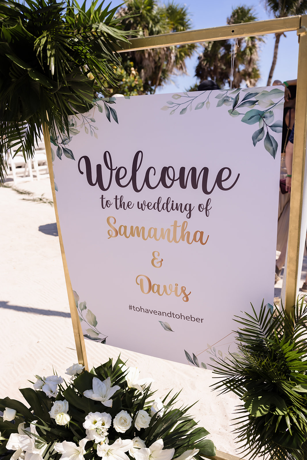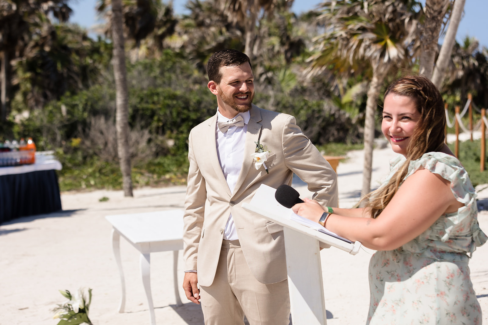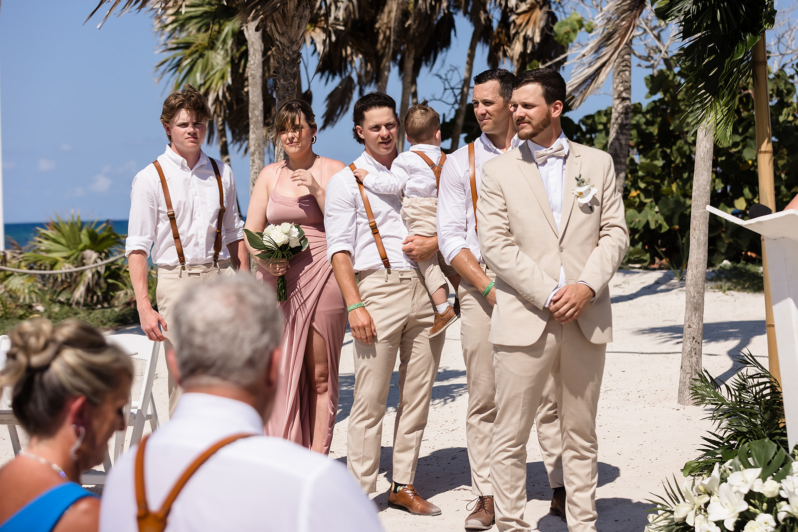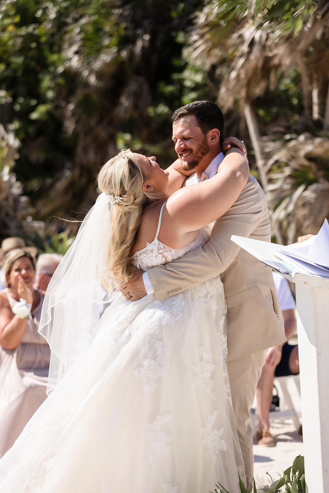 Their ceremony took place right on the sand, framed by the ocean and soft tropical florals. As Samantha walked in, smiles spread through the crowd and Davis’ face said everything as he wiped his eyes. The waves rolled in gently as they exchanged vows, creating an intimate atmosphere that felt both peaceful and powerful.