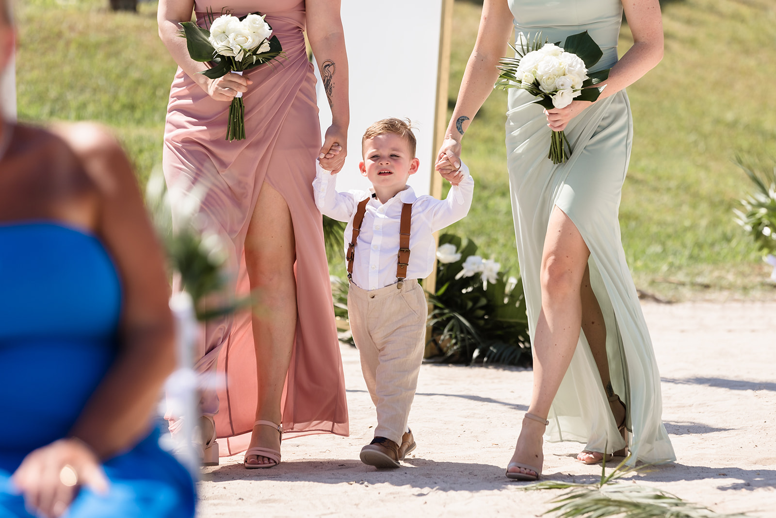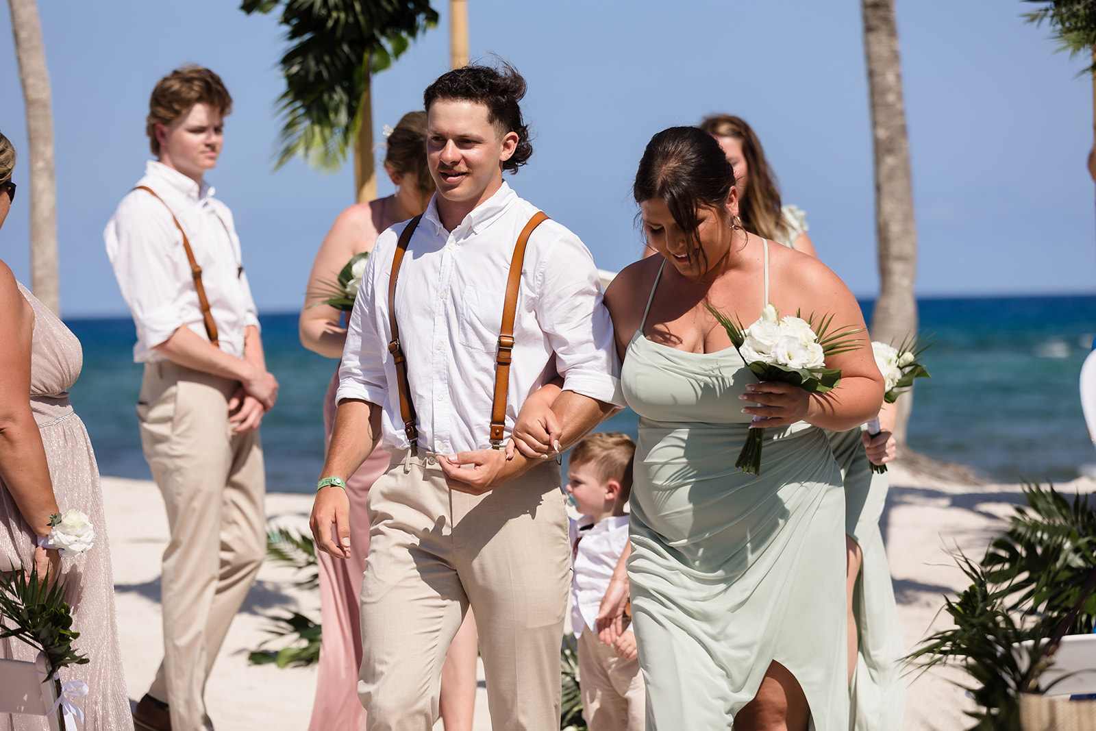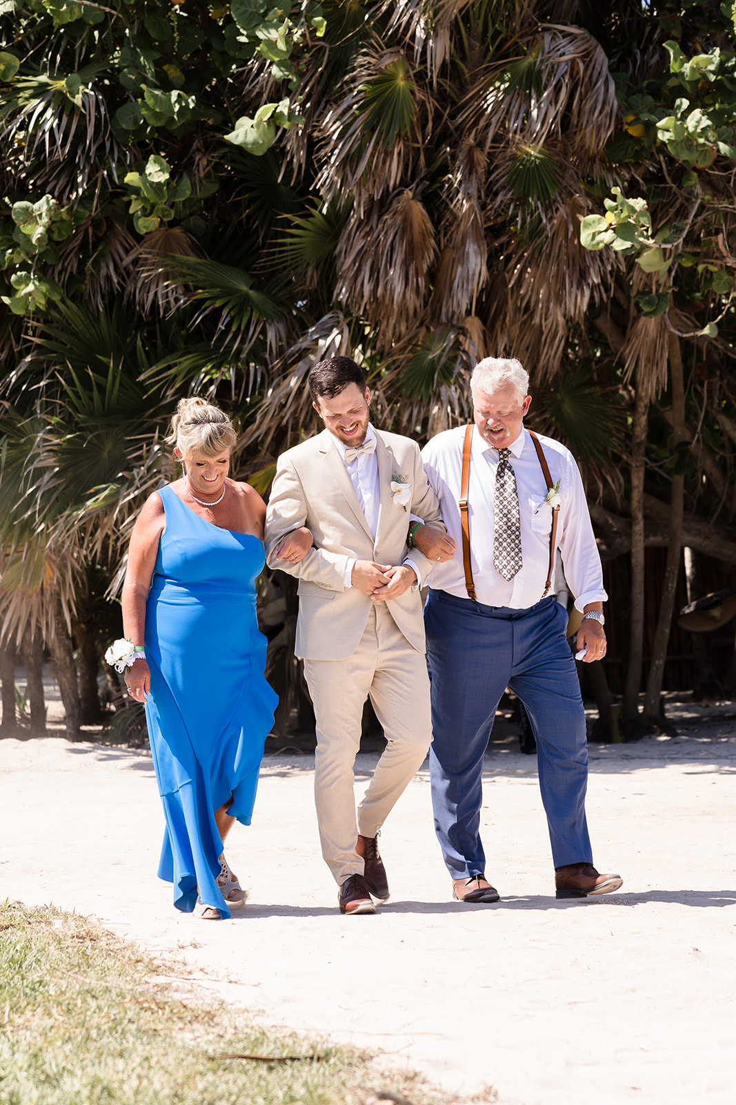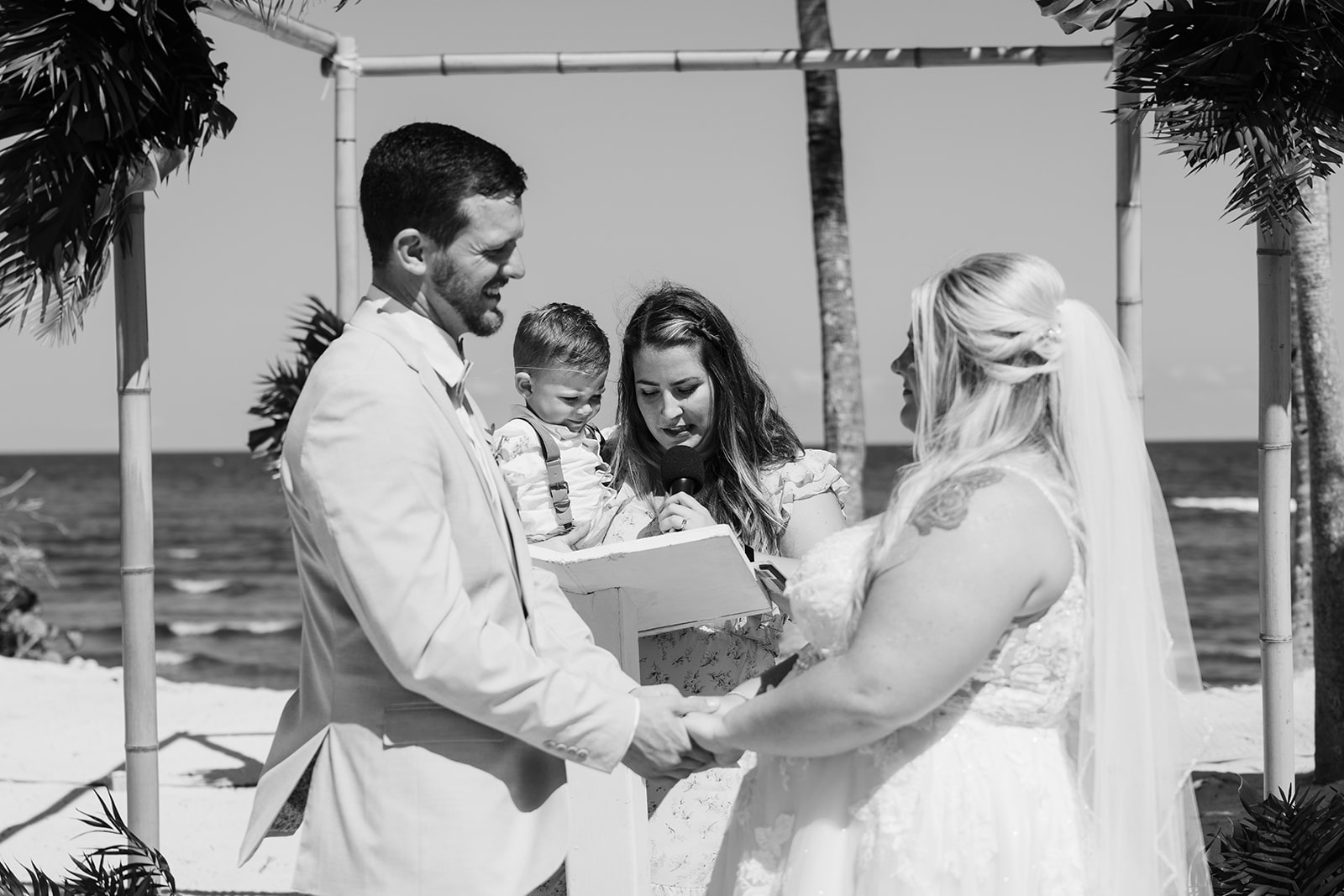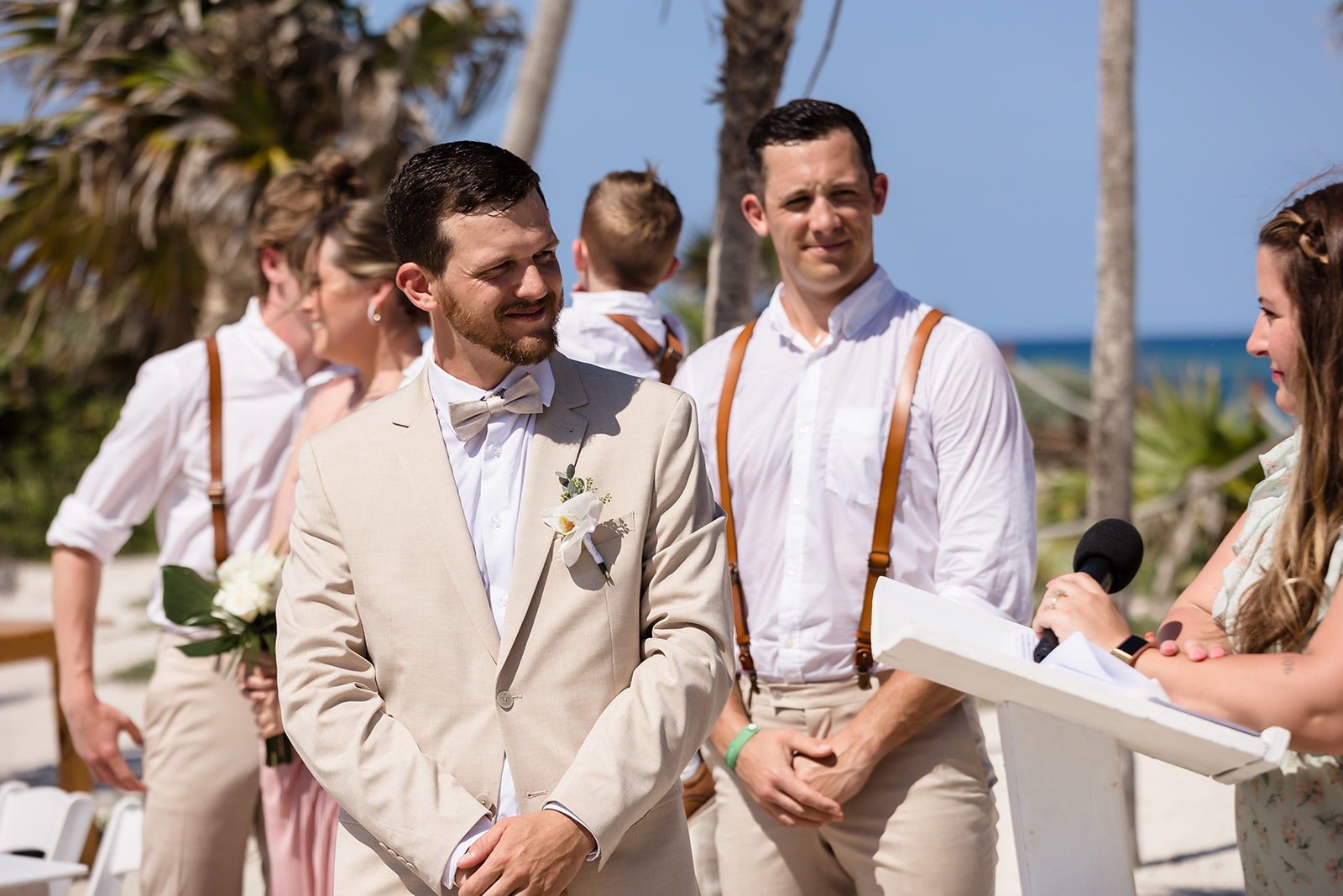Their ceremony took place right on the sand, framed by the ocean and soft tropical florals. As Samantha walked in, smiles spread through the crowd and Davis’ face said everything as he wiped his eyes. The waves rolled in gently as they exchanged vows, creating an intimate atmosphere that felt both peaceful and powerful.
