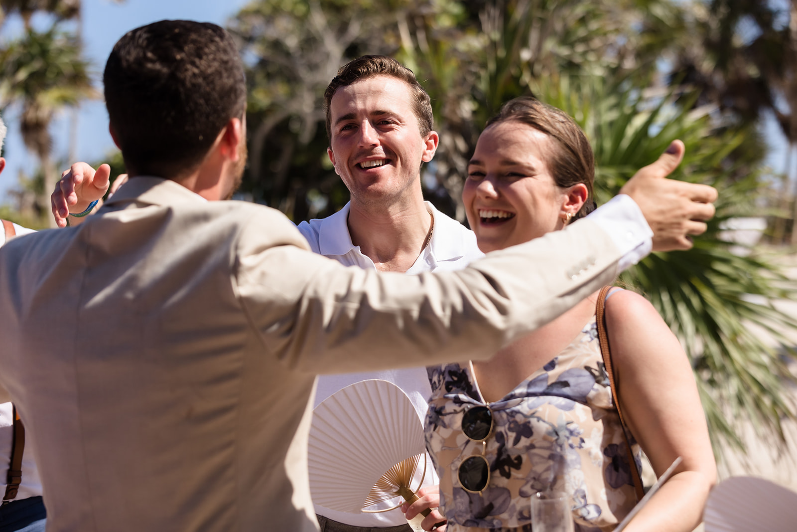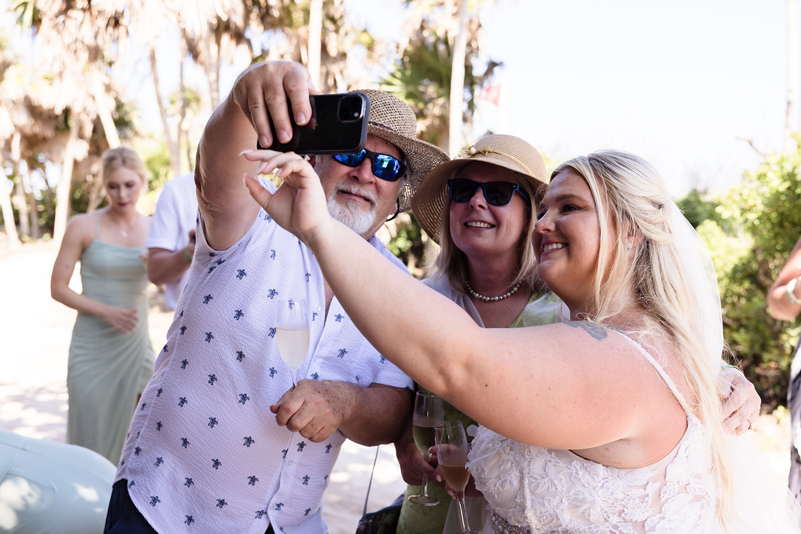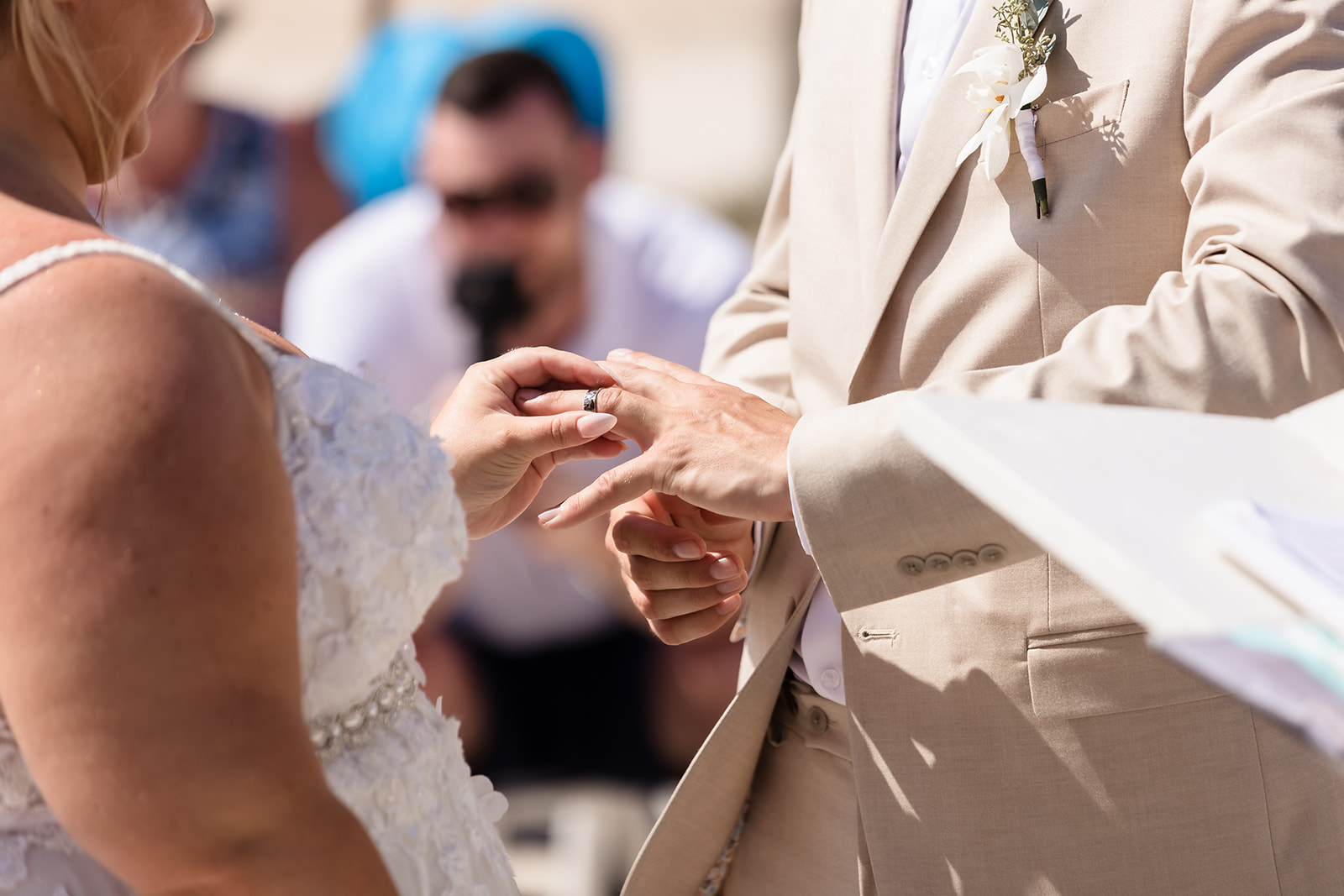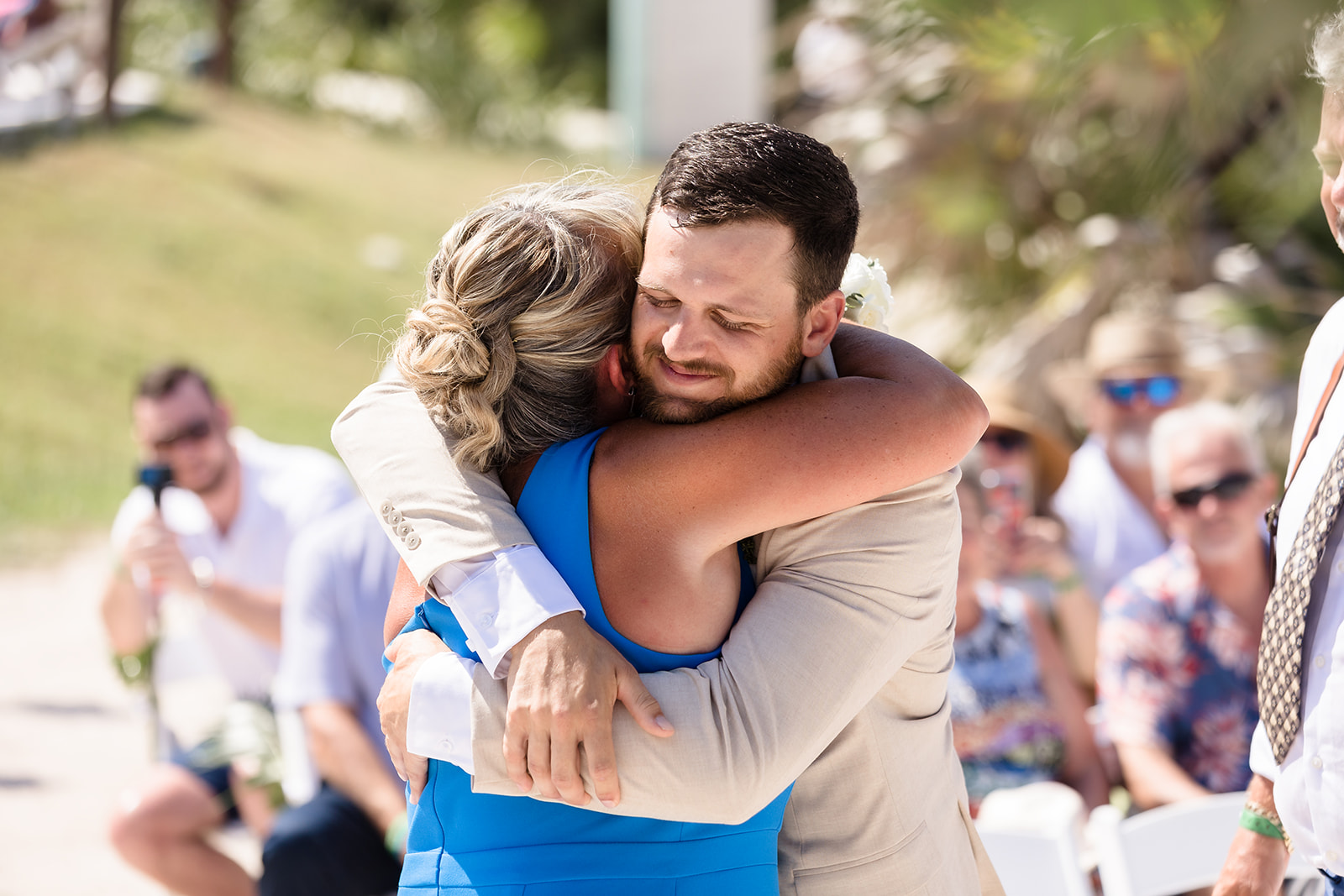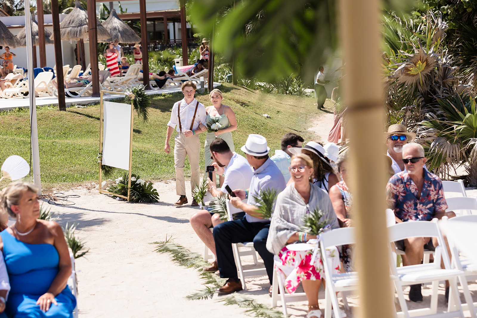 Their ceremony took place right on the sand, framed by the ocean and soft tropical florals. As Samantha walked in, smiles spread through the crowd and Davis’ face said everything as he wiped his eyes. The waves rolled in gently as they exchanged vows, creating an intimate atmosphere that felt both peaceful and powerful.