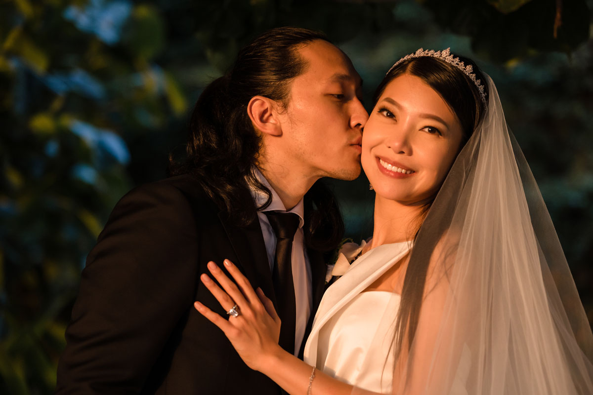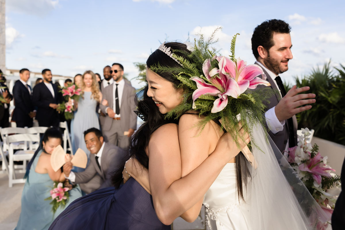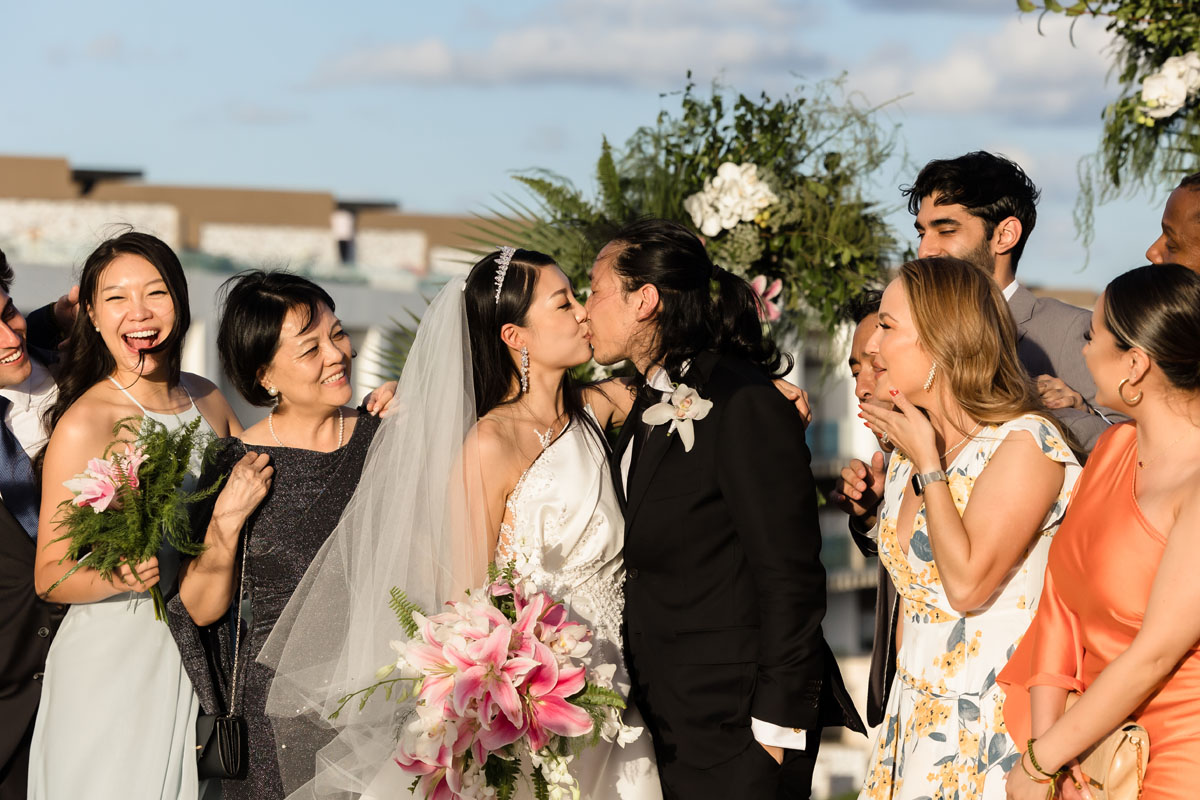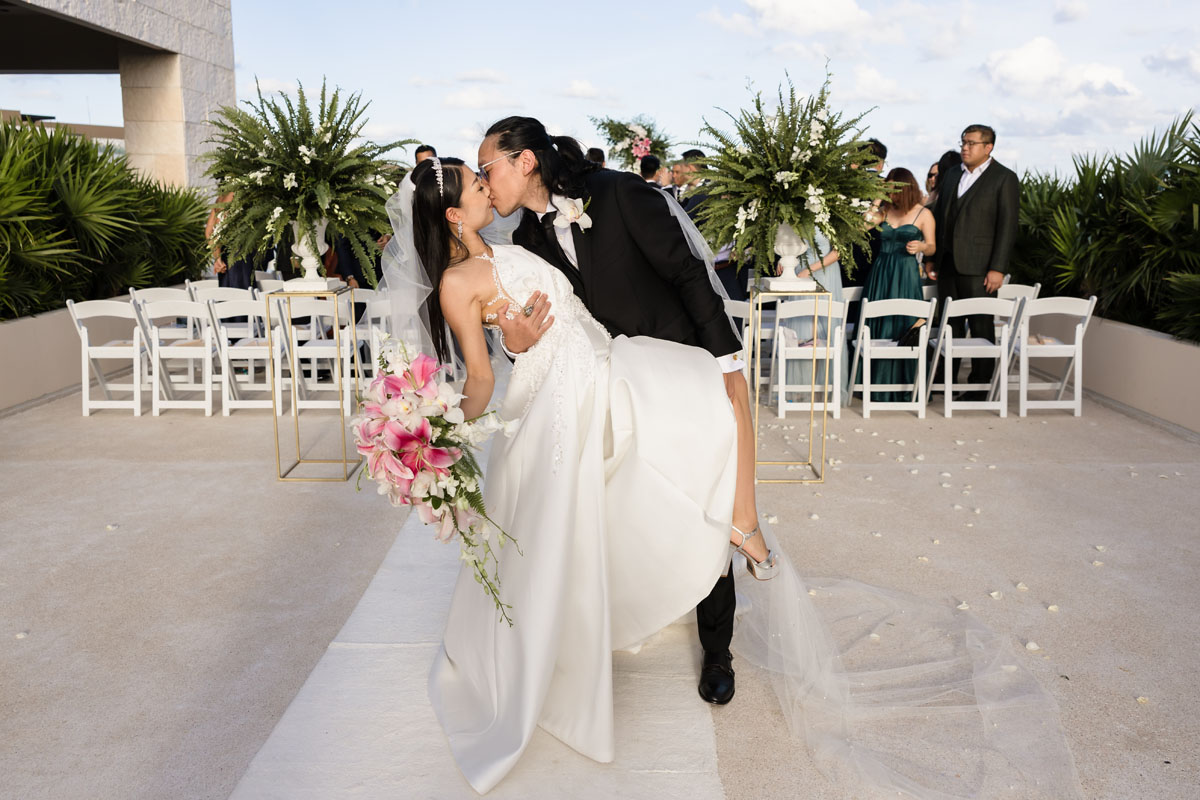 Newlyweds dip in a kiss under shower of petals