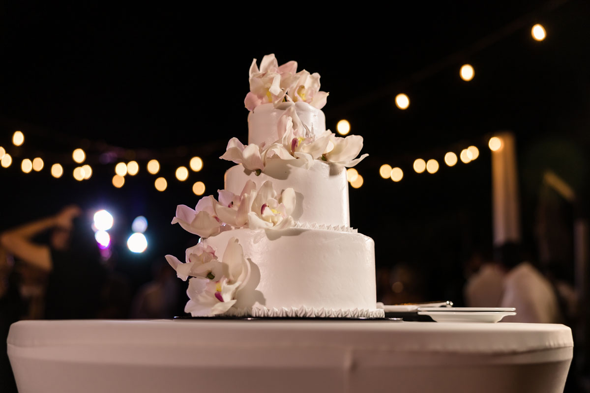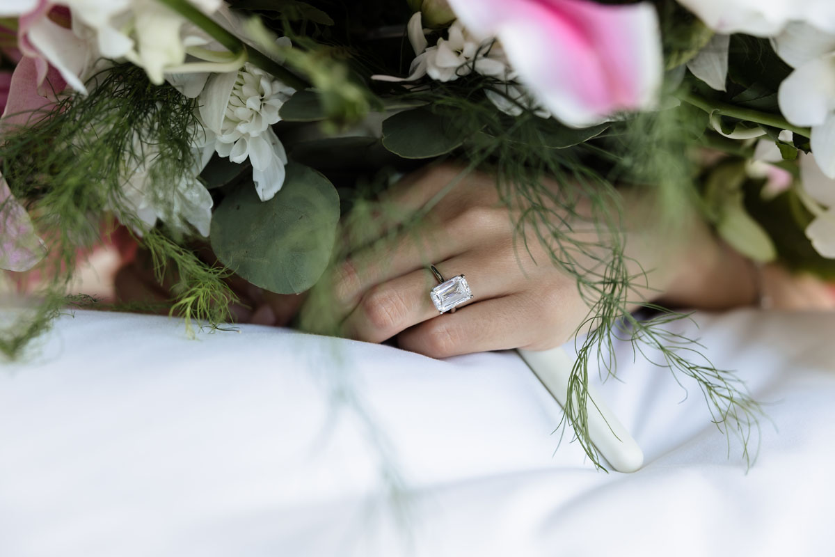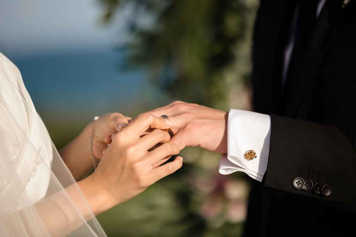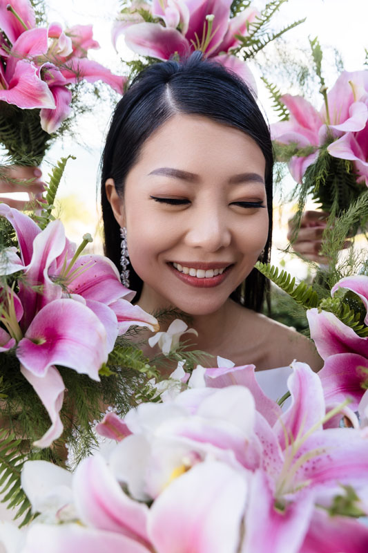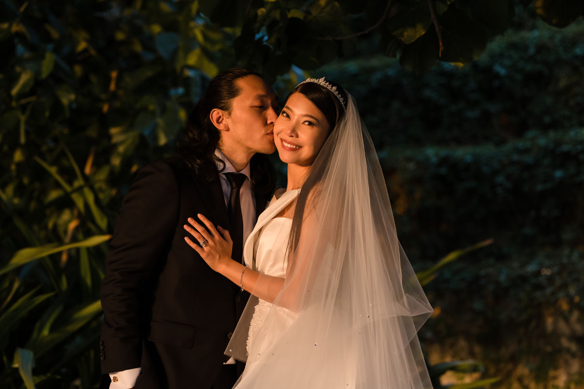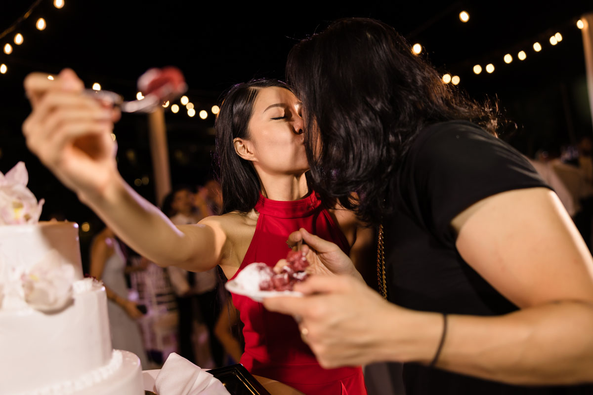 Newlyweds dip in a kiss under shower of petals