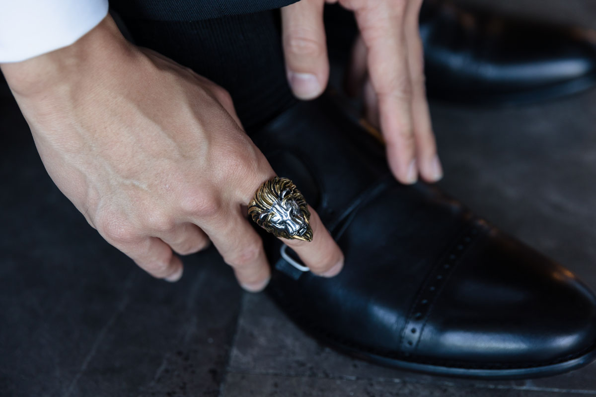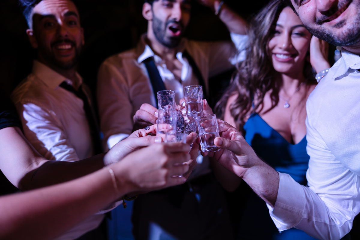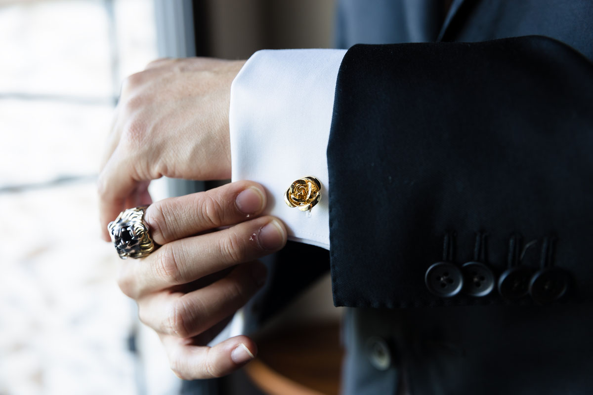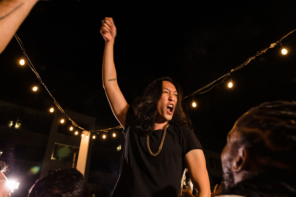 Newlyweds dip in a kiss under shower of petals