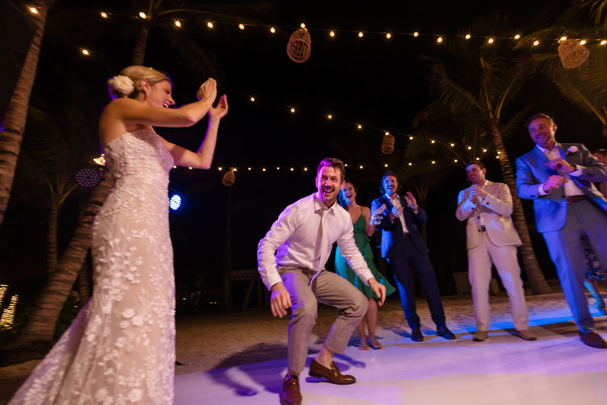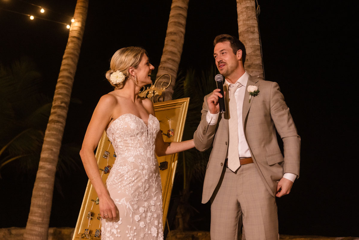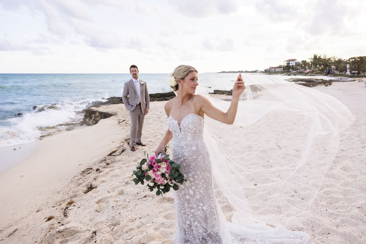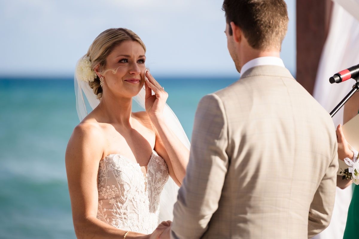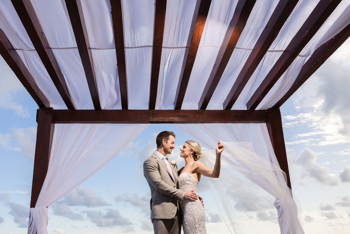 Their beachfront ceremony was framed by a picturesque pagoda with billowing white curtains tied back by huge tropical flower arrangements. Emotions ran high as Alisha walked down the sandy aisle with the turquoise Caribbean Sea sparkling behind her.