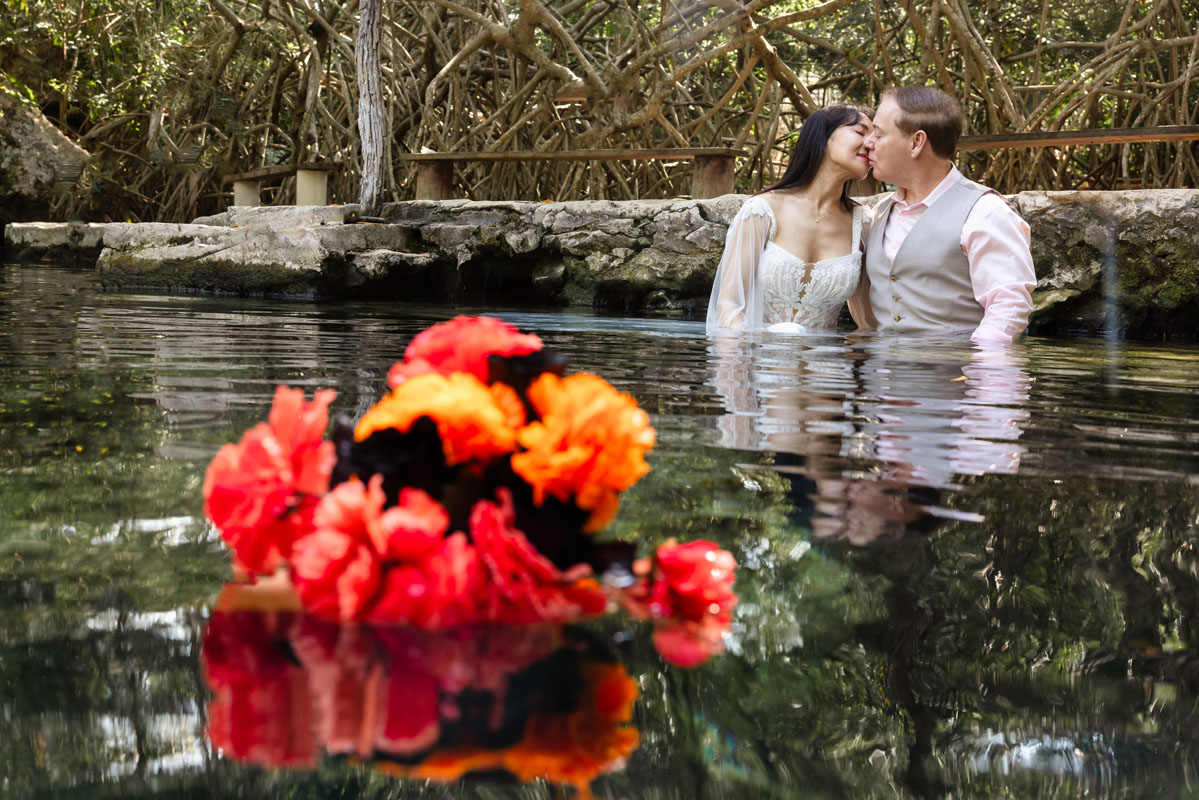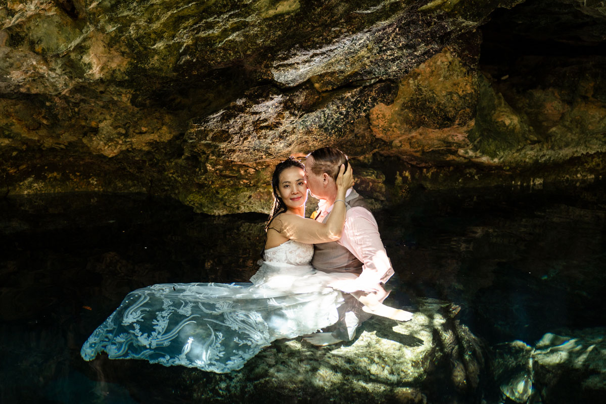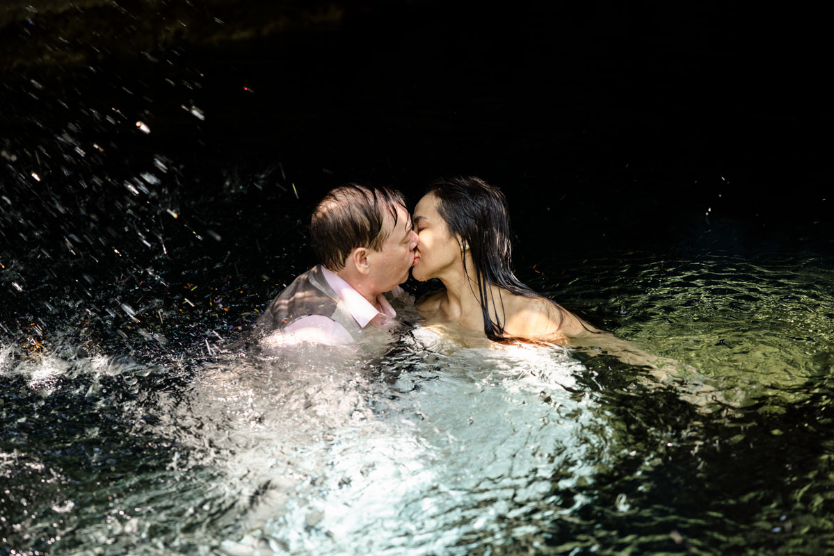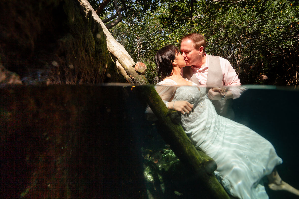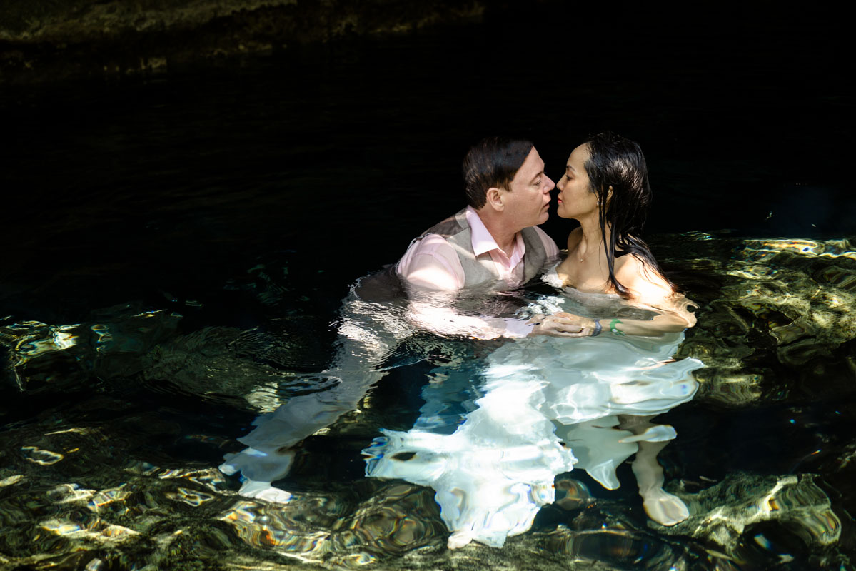 Annie + Mark kiss in the crystal clear waters of an ancient sacred cenote