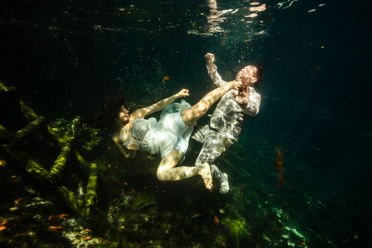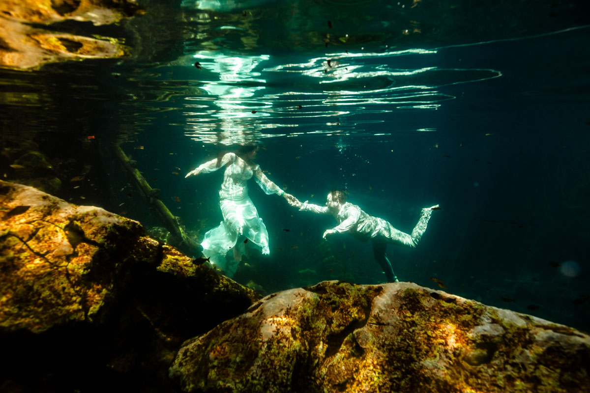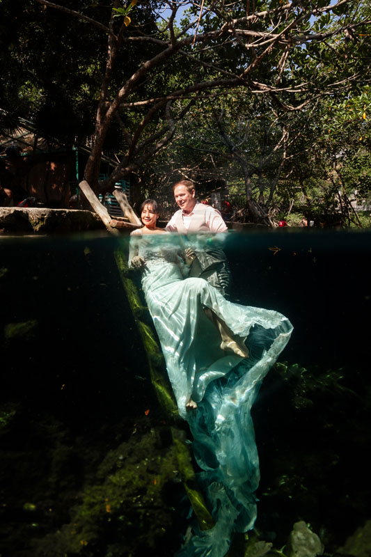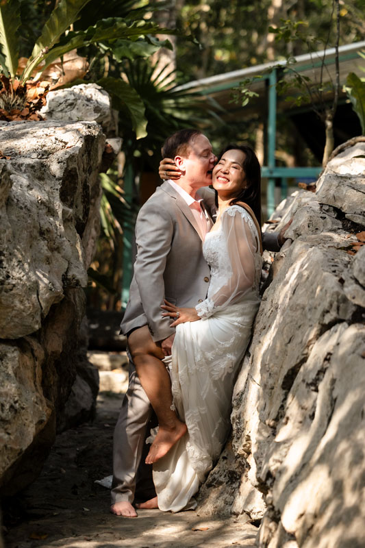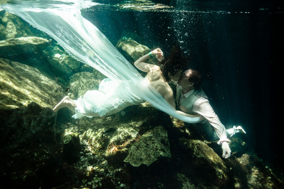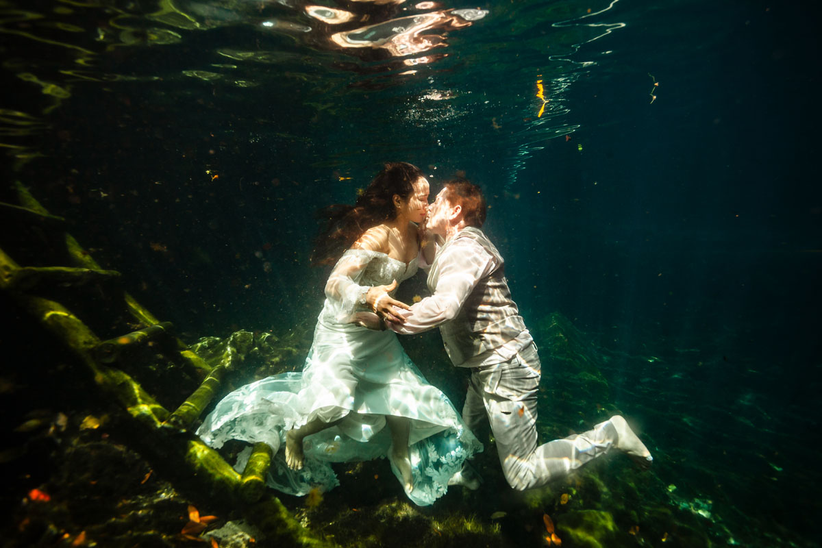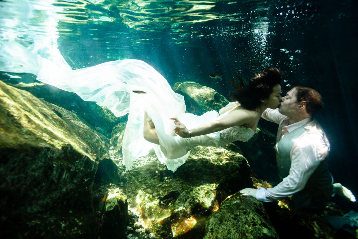 Annie + Mark kiss in the crystal clear waters of an ancient sacred cenote