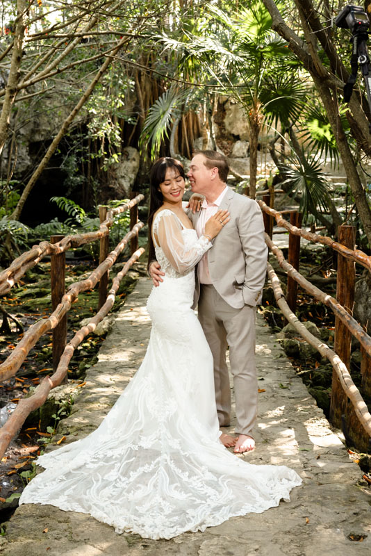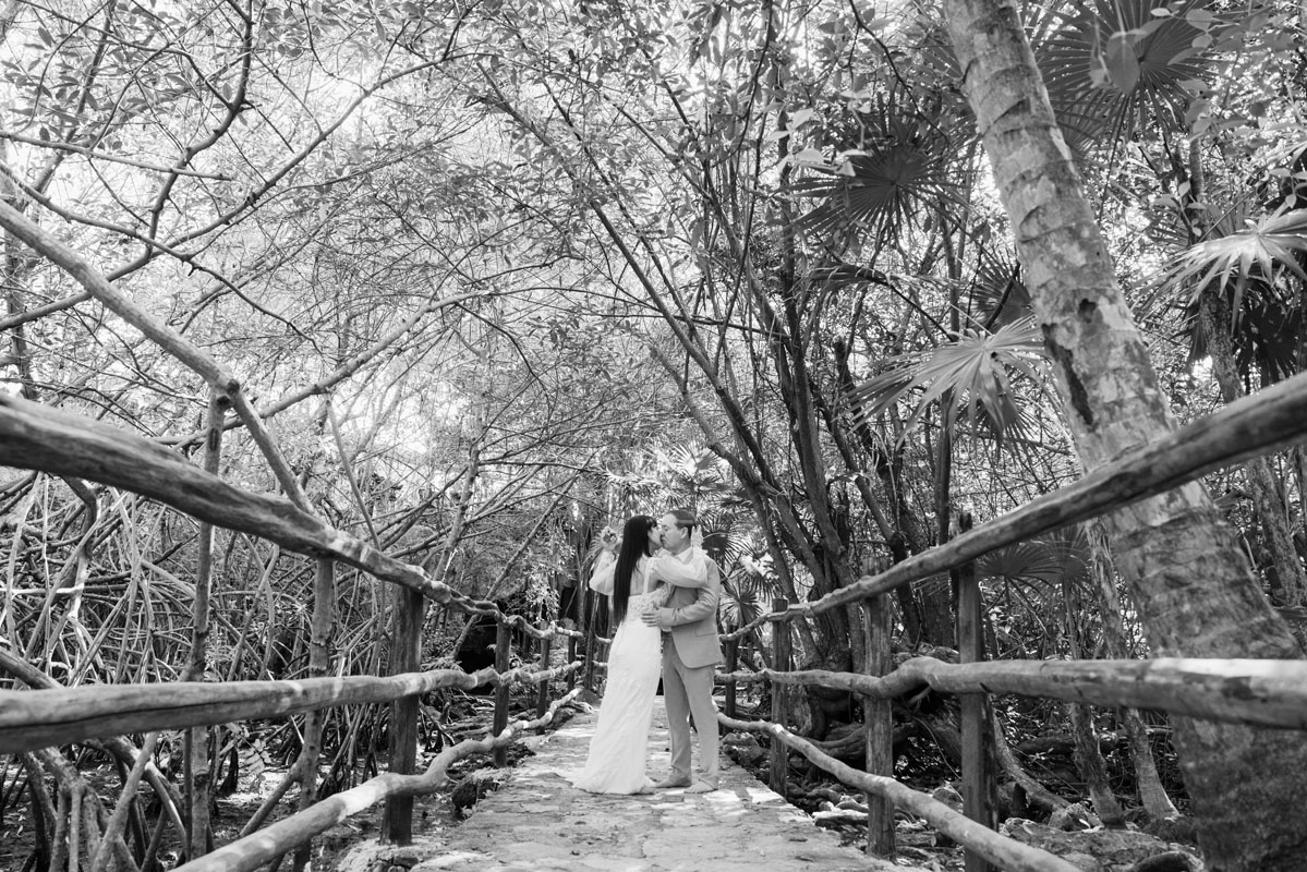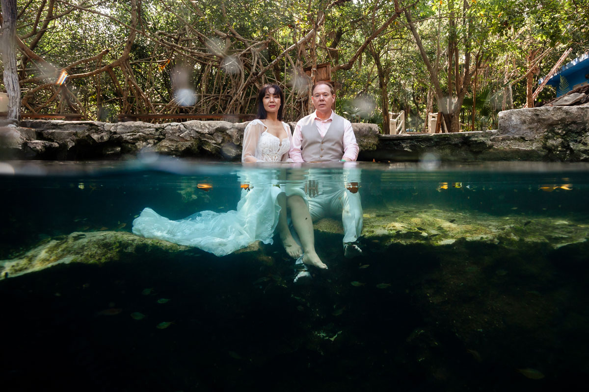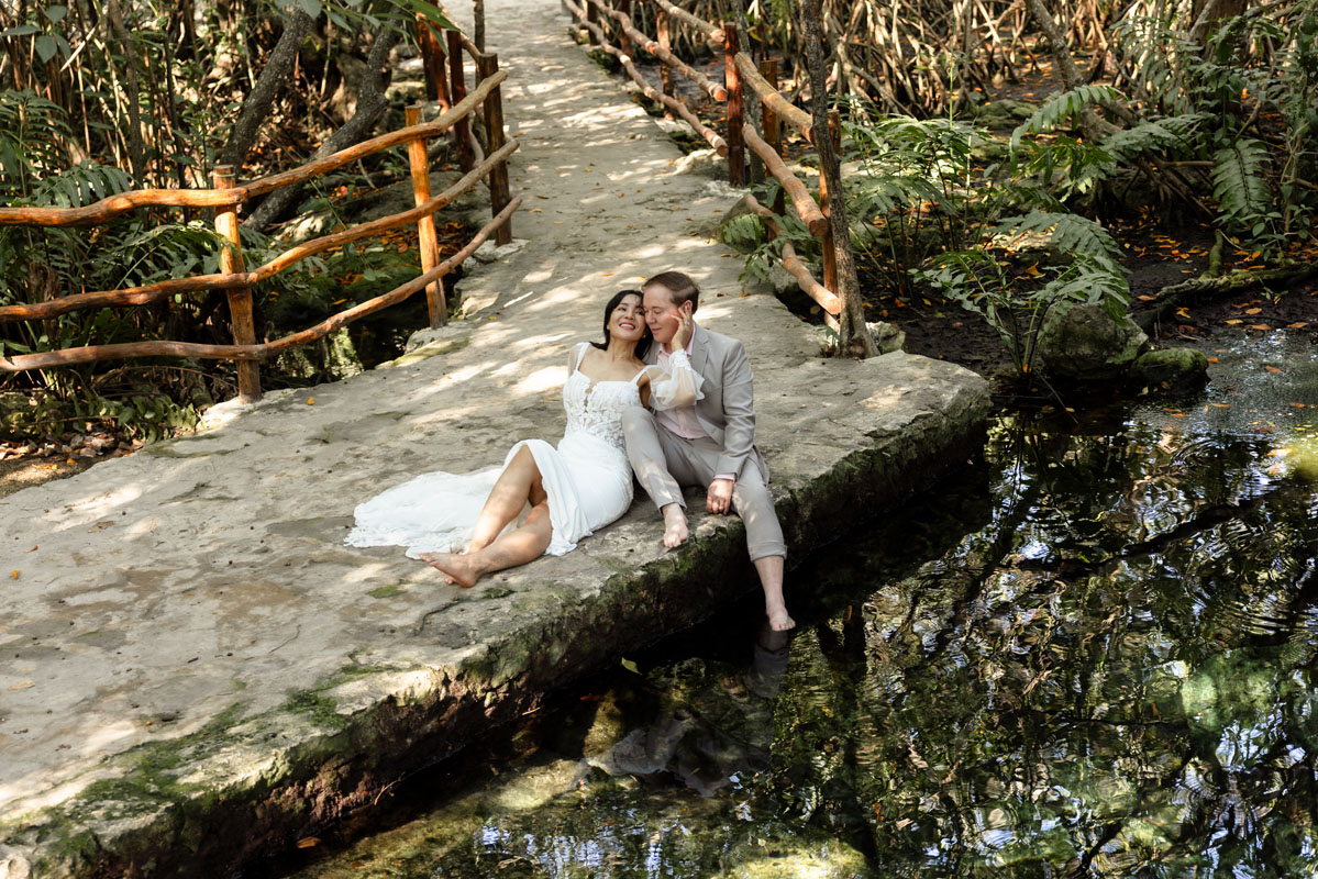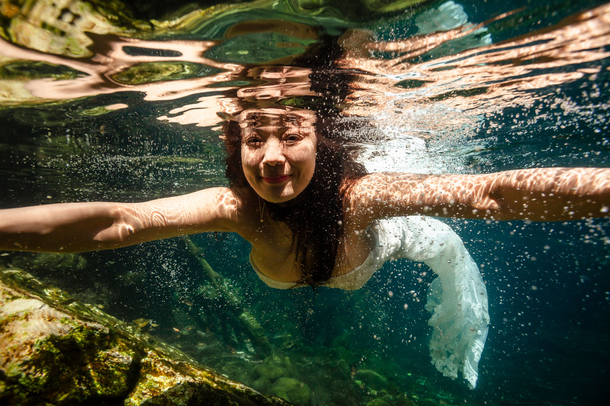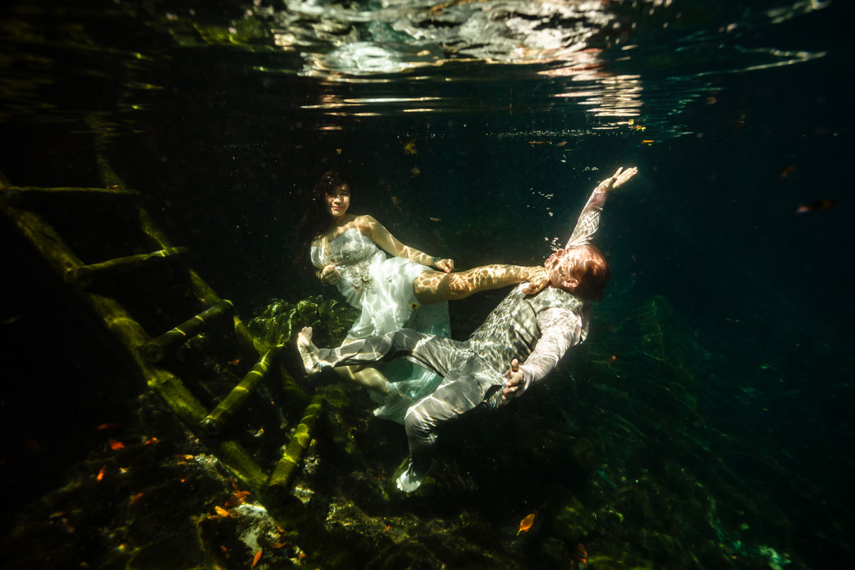 Annie + Mark kiss in the crystal clear waters of an ancient sacred cenote