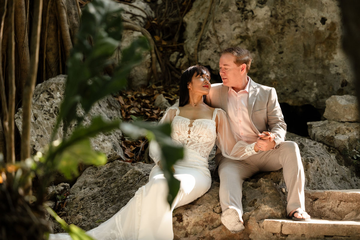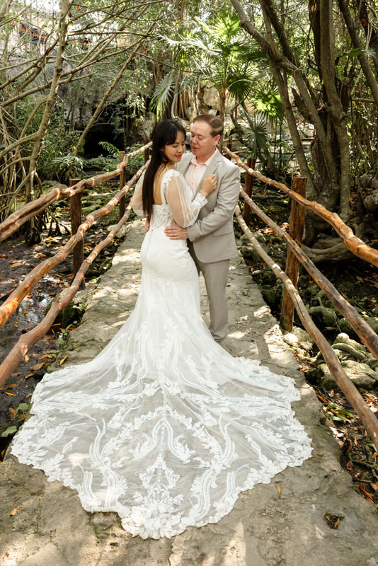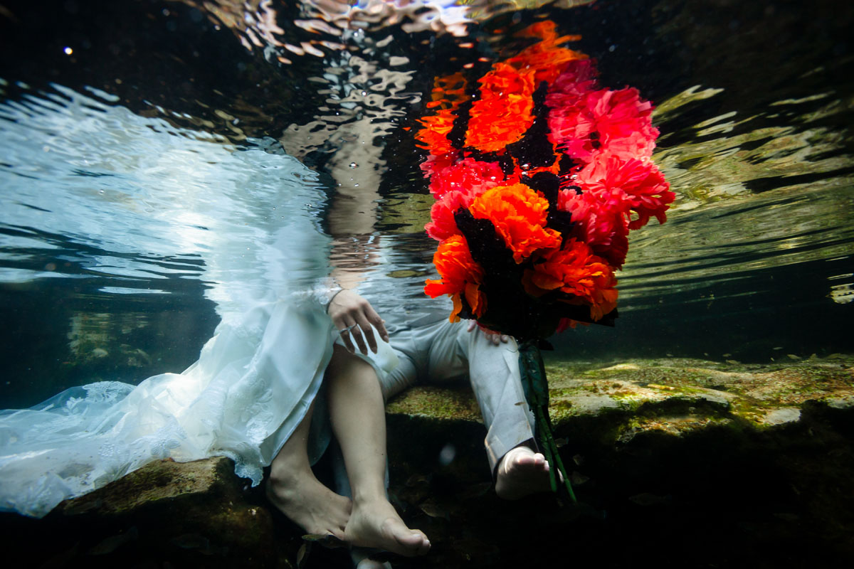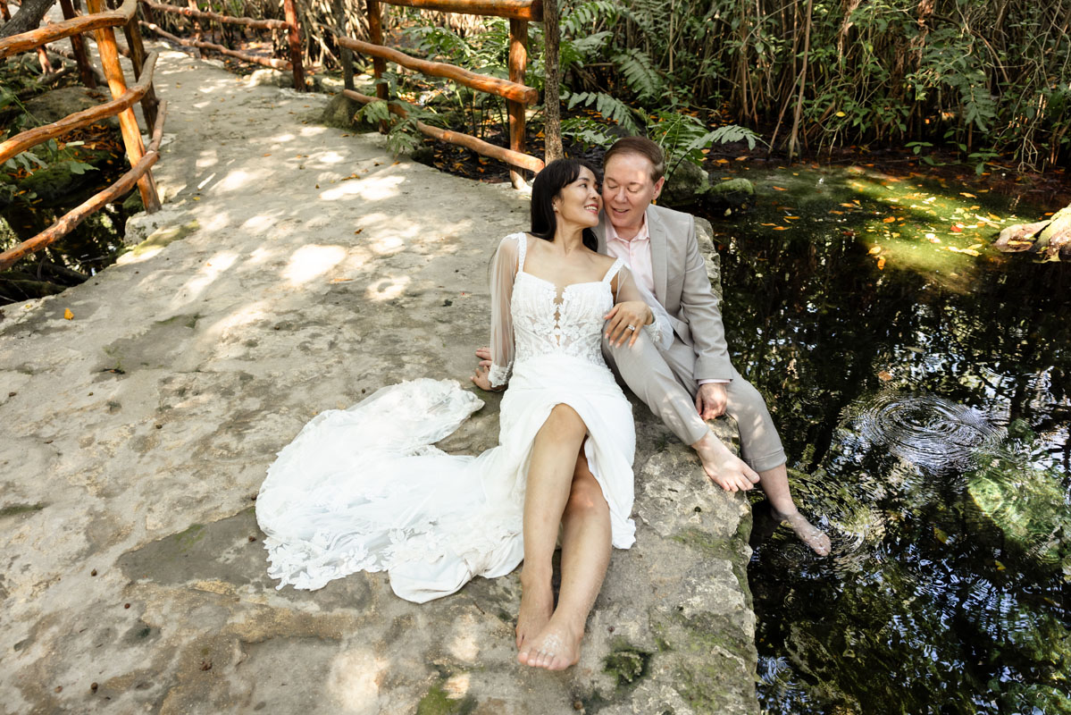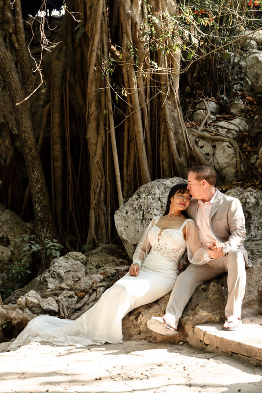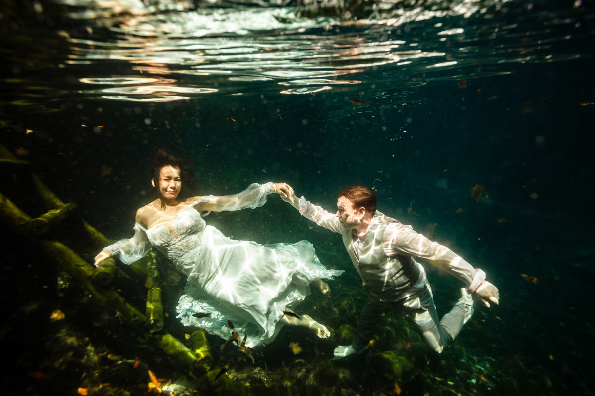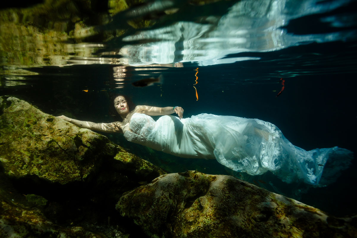 Annie + Mark kiss in the crystal clear waters of an ancient sacred cenote
