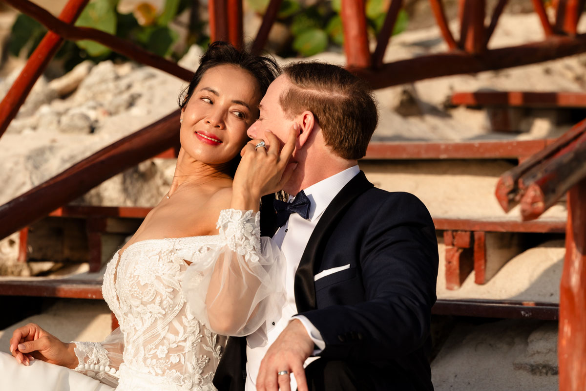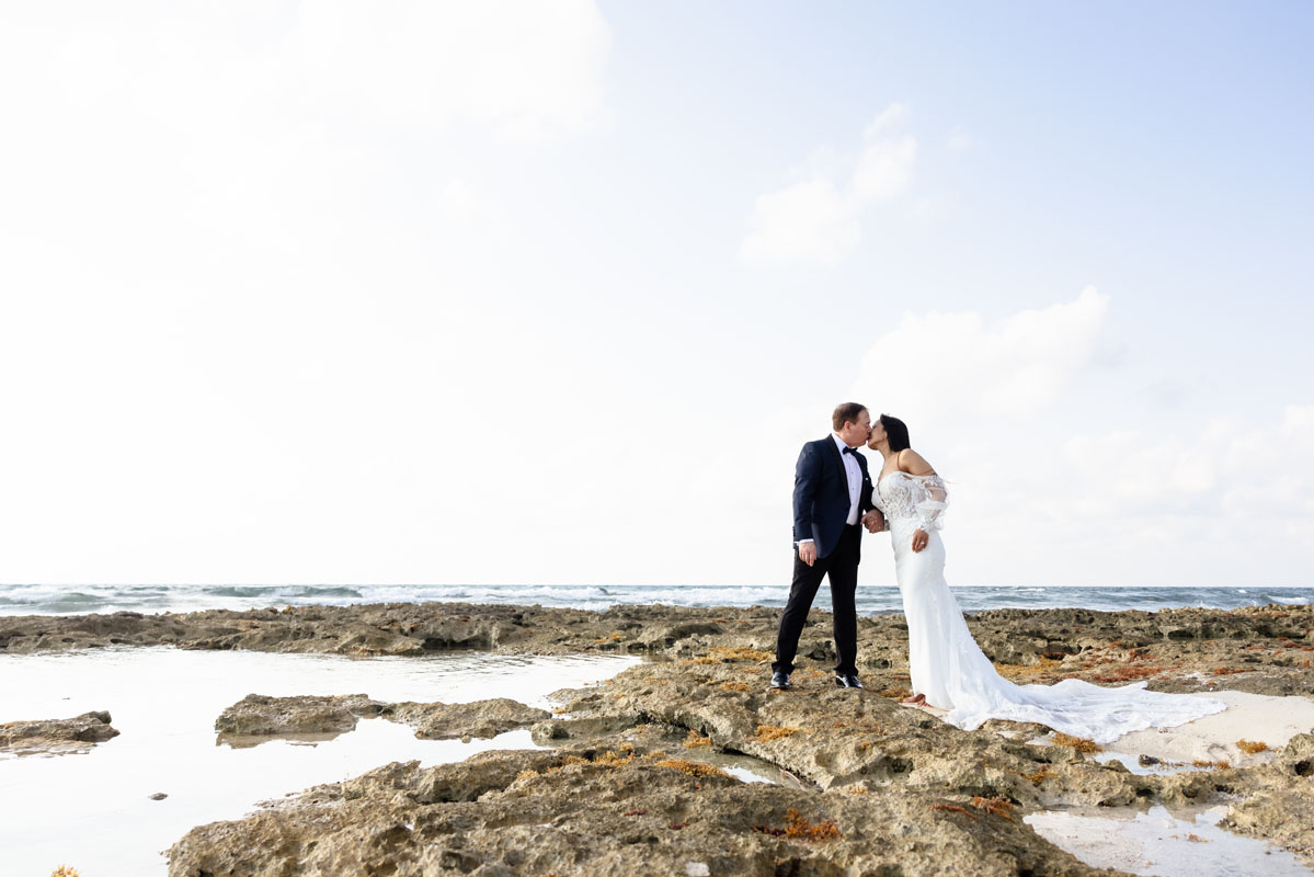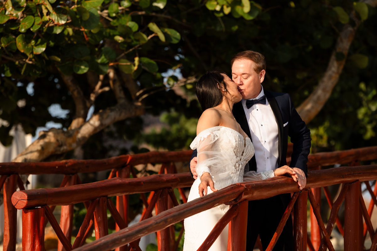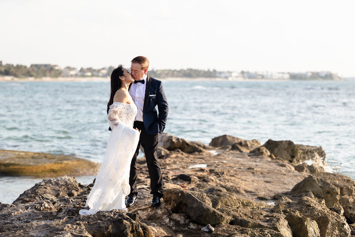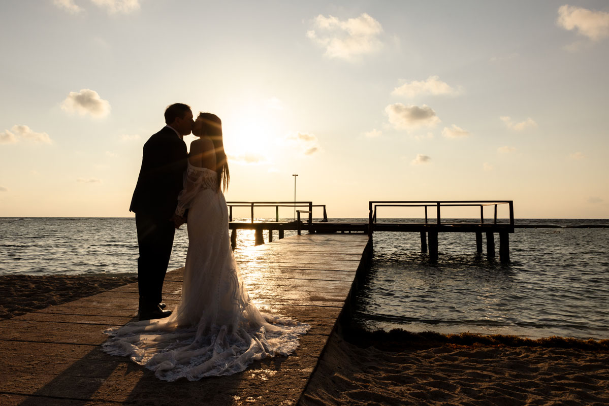 Annie + Mark kiss in the crystal clear waters of an ancient sacred cenote
