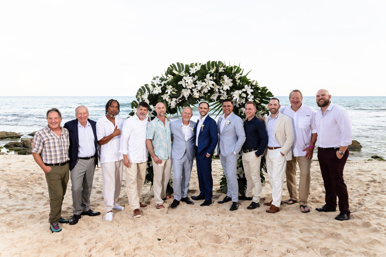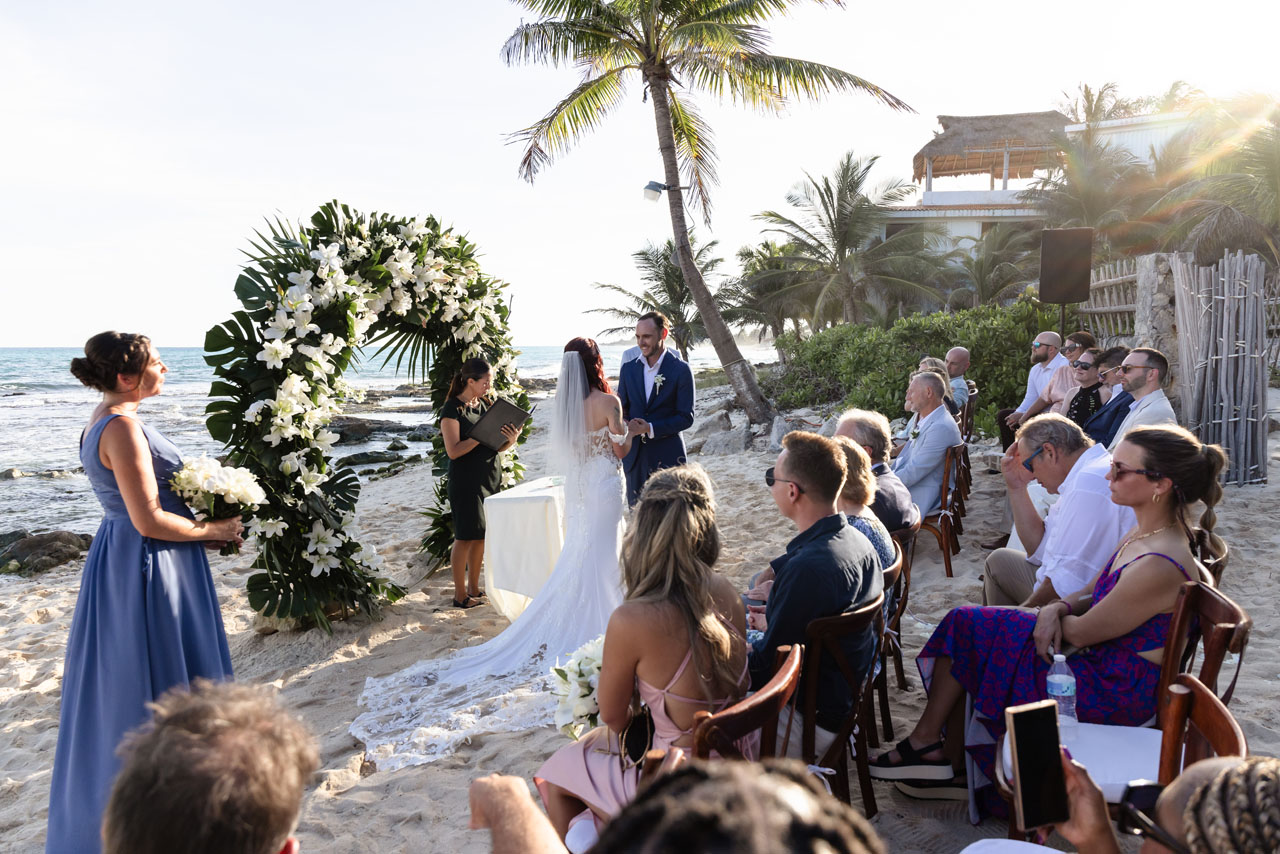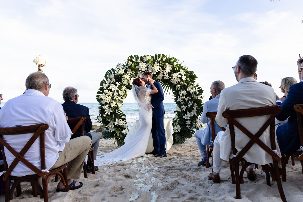 Their beachfront ceremony was simple and touching. A giant circle of elaborate flowers framed a small table at the front. Chairs were set right on the sand, filled with friends and family who’d traveled from all over to lend their love and support, sharing the Big Day.