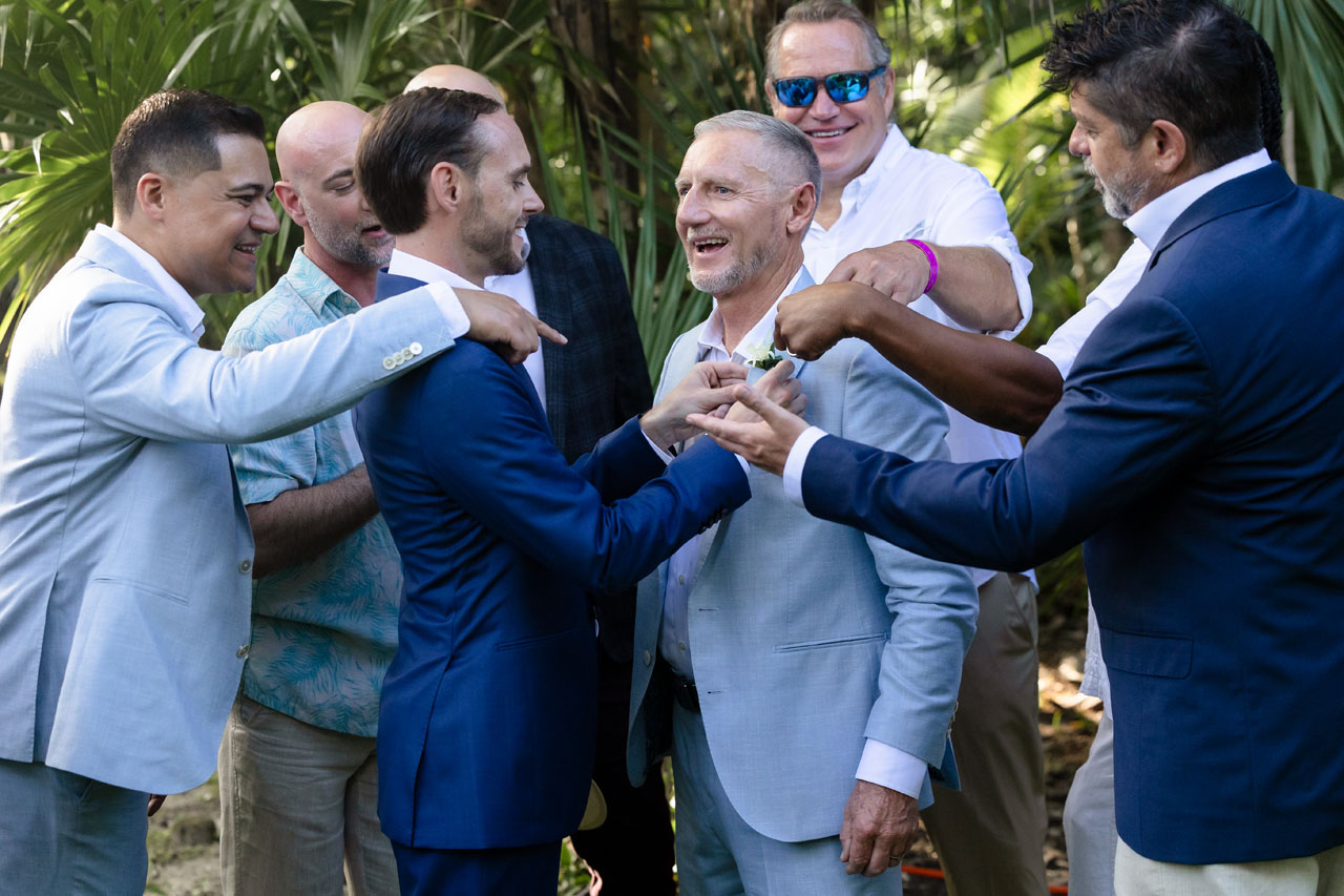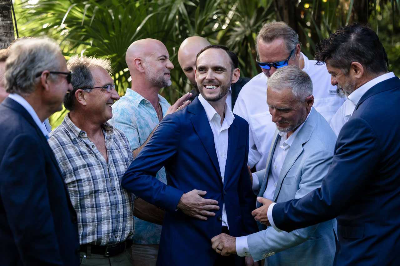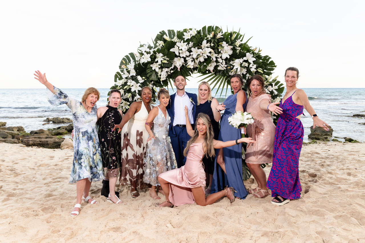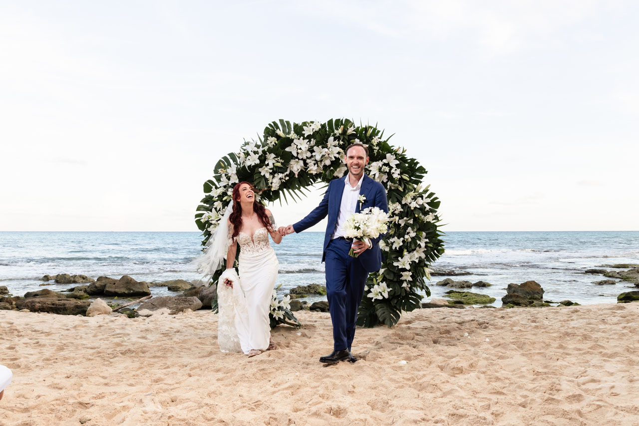 Their beachfront ceremony was simple and touching. A giant circle of elaborate flowers framed a small table at the front. Chairs were set right on the sand, filled with friends and family who’d traveled from all over to lend their love and support, sharing the Big Day.